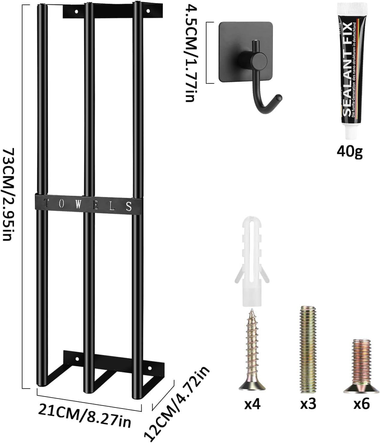 • Izredno prostorno stojalo za brisače: To stojalo za brisače meri 73 × 21 × 12 cm in nudi prostor za do 12 kopalnih brisač (140 × 70 cm). Priloženo je držalo za brisače brez vrtanja, zaradi česar je priročno za obešanje mokrih brisač ali kopalnih plaščev.