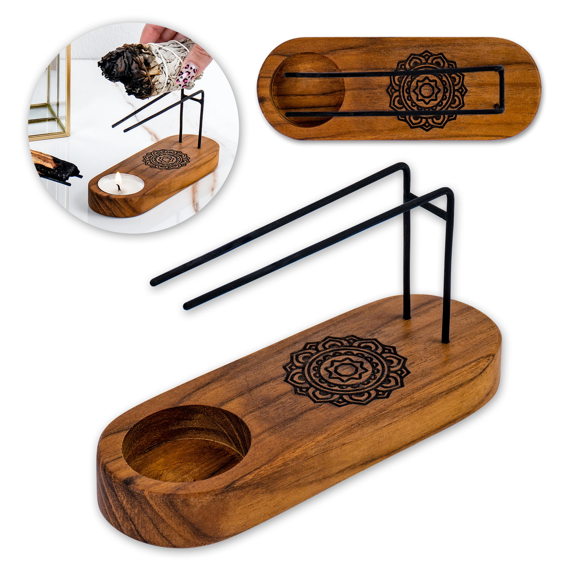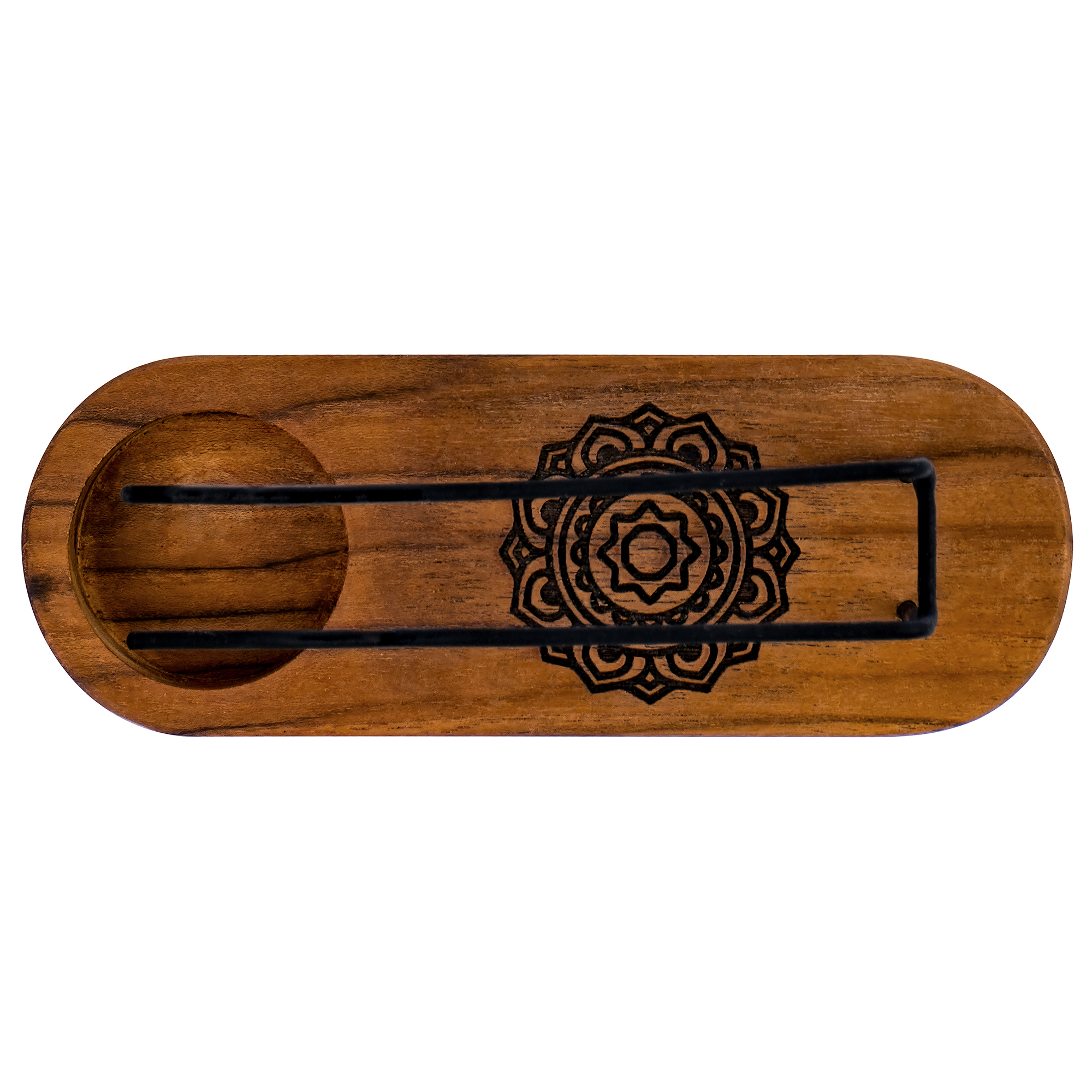Minimalističen, a izjemno funkcionalen držalo za kadilne palčke je bil zasnovan z mislijo na varnejše kurjenje naravnega kadila. Njegova oblika omogoča priročno postavitev rastlinskih kadilnih palčk in popoln nadzor nad njihovim zgorevanjem. Izdelan je iz trpežnega in privlačnega tikovega lesa ter vam bo nudil neverjetno izkušnjo še vrsto let . Varno kurjenje kadila