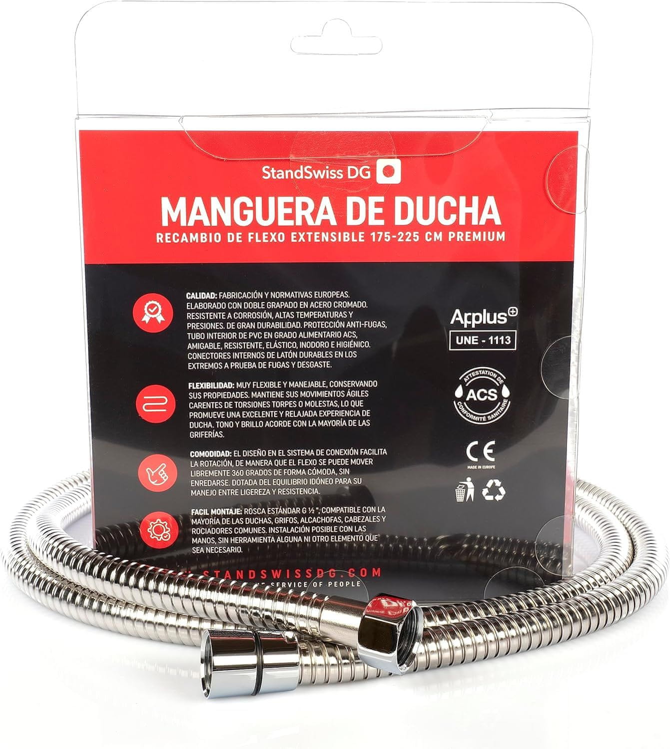 - Kakovost: Ta cev za tuš je izdelana v skladu z evropskimi predpisi in je neuničljiva, zelo trpežna in odporna na visoke temperature. Zaradi svoje trdnosti in odpornosti proti koroziji je izdelek, ki bo zdržal vrsto let.