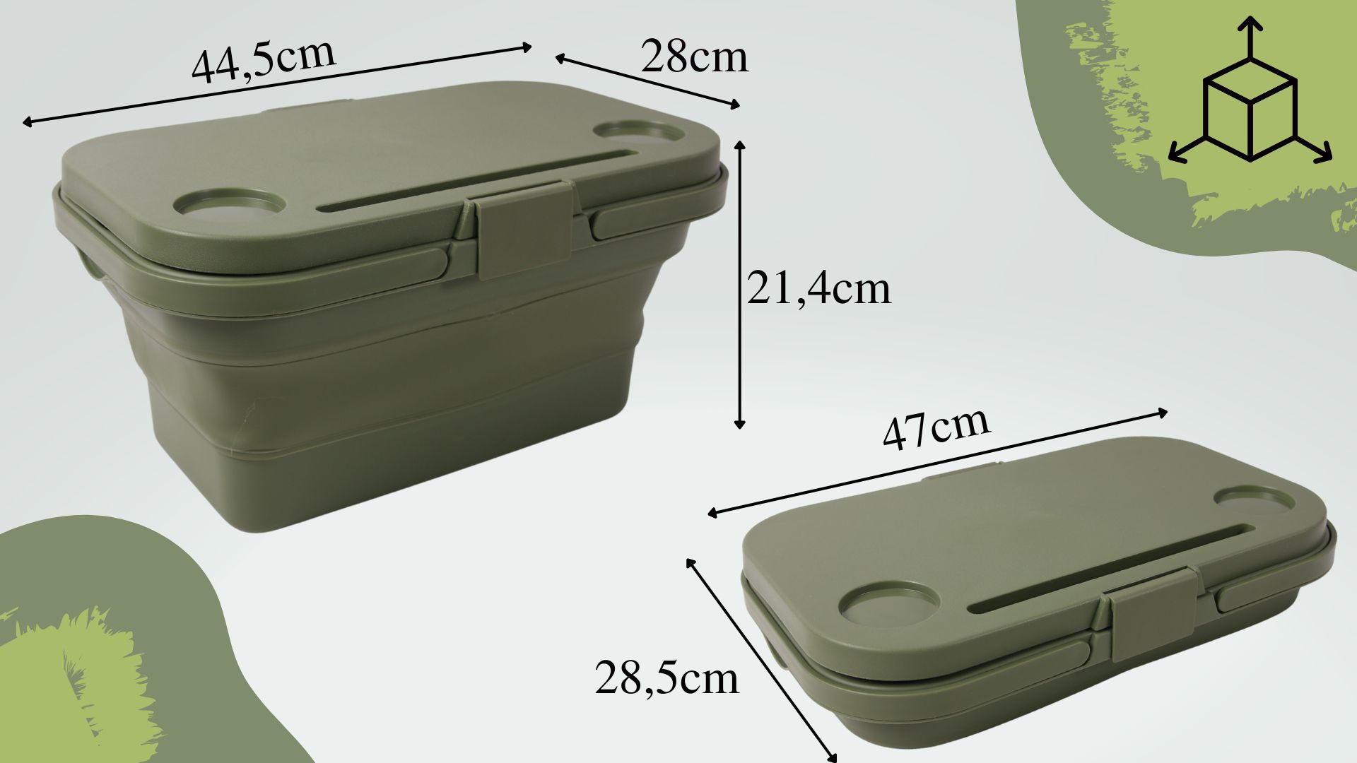 • Dno košare je izdelano iz močne plastike. Zložljivost zagotavljajo silikonski elementi v zelenih odtenkih. Košaro je mogoče zložiti na manjšo velikost, njeno shranjevanje pa zahteva malo prostora.