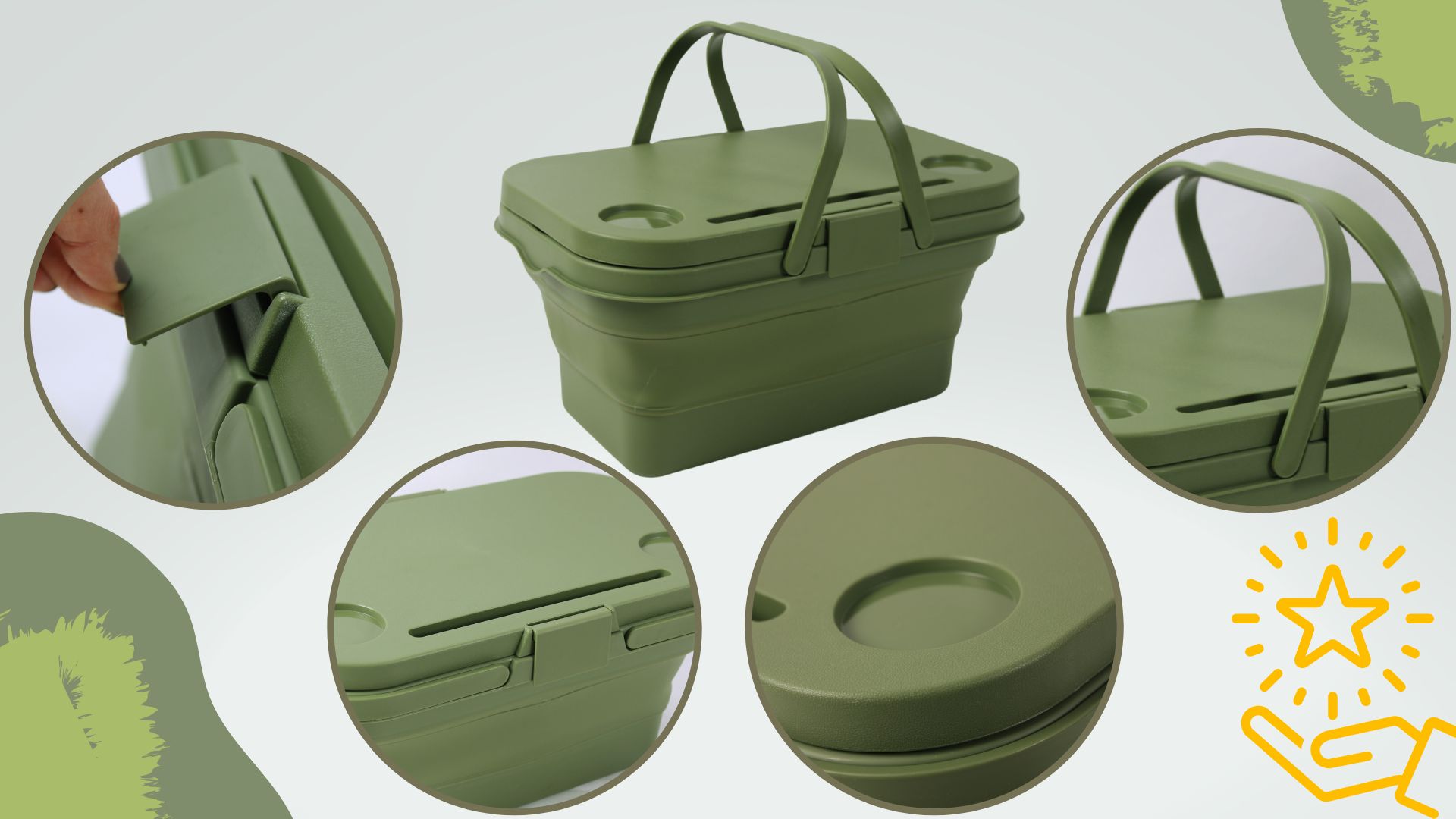 • ✅Zložljiva – Dno košare je izdelano iz močne plastike. Zložljivost zagotavljajo zeleni silikonski elementi. Košaro je mogoče zložiti na majhno velikost, njeno shranjevanje pa zahteva malo prostora.