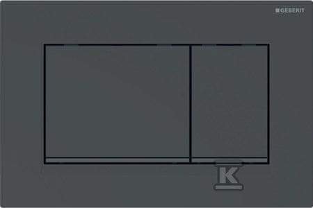 Geberit Sigma20 splakovalna tipka s sprednjo montažo. Črna svetleča plošča in gumbi, dopolnjeni s črnimi mat dekorativnimi letvami. Pravokotna oblika, izdelana iz trpežne plastike.