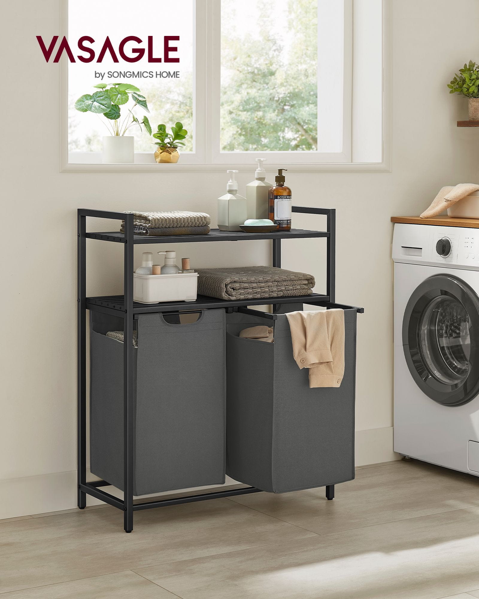 Ta košara za perilo ima dva predelka za enostavno ločevanje in police za priročno shranjevanje detergentov in drugih potrebščin. Njena robustna zasnova pomaga ohranjati perilo organizirano in skrito, zato je idealna za kopalnice ali pralnice. Celoten opis