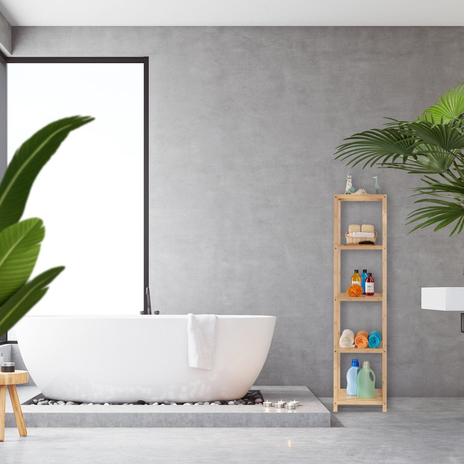 Kopalniška polica iz bambusa ponuja dovolj prostora za shranjevanje s petimi okrasnimi policami, popolnimi za organiziranje kopalniških pripomočkov. Njegov tanek dizajn poveča prostor v manjših kopalnicah in hkrati doda naraven pridih.