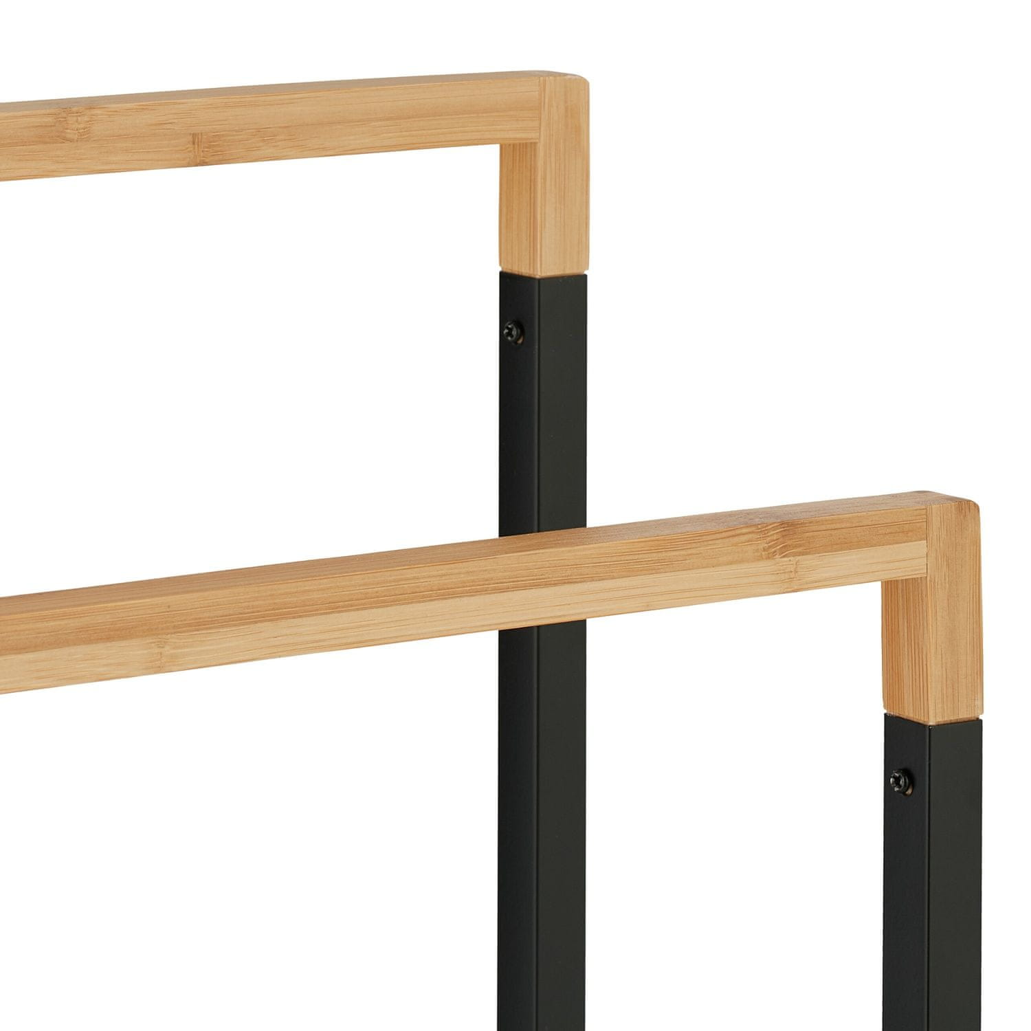 Prostostoječe držalo za brisače izboljša stil kopalnice, hkrati pa zagotavlja hitro sušenje brisač. Njegov sodoben dizajn združuje železo in bambus za vzdržljivost in estetsko privlačnost, zaradi česar je praktična izbira za vsak dom.