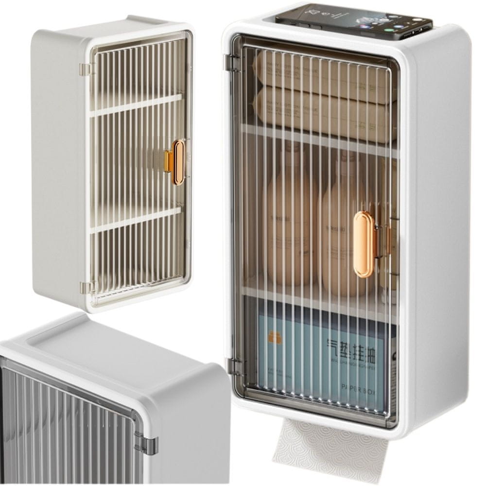 Na dnu je praktična odprtina za robčke, tako da jih lahko priročno odstranite z eno roko. Zgornji del omarice služi kot stojalo za telefon, kar je idealno za gledanje filmov ali poslušanje glasbe v kopalnici. Premišljena oblika in vrata ščitijo vsebino pred vlago.