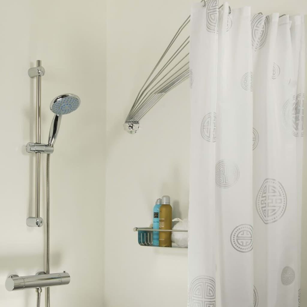 Tako lahko ustvarite tuš kabino za svojo kad ter resnično uživate v tuširanju, brez da bi pri tem poškropili celo kopalnico. Kromiran sistem za obešanje je odlična alternativa klasičnim nosilcem za zavese v običajnih kopalnicah, saj ne zavzame veliko prostora: ko ni v uporabi, ga lahko brez težav obrenete na stran.