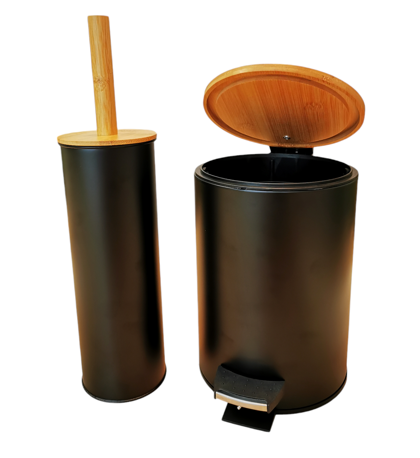 Koš za smeti ni primeren le za kopalnico, ampak tudi za druge prostore vašega doma. Koš ima odstranljivo posodo, ki omogoča enostavno vzdrževanje in enostavno rokovanje. Koš za odpadke s prostornino 3 litre je na voljo v mat črni barvi in ima pokrov iz bambusa z mehkim zapiranjem SOFT CLOSE. V kompletu s straniščno krtačo. Dimenzije izdelka Koš 17×17×22,5 cm; krtača 9,5×9,5×38 cm. Pakirano v PE vrečki in škatli.