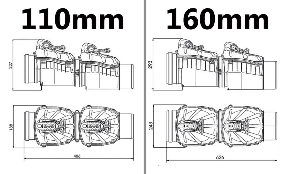 Naprave imajo dva neodvisna zaščitna pokrova, kar je koristno med povratnim tokom vode, saj se tlak, ki deluje na prvo loputo, ne prenese takoj na drugo. Specifikacija: – Premer: 110 mm – Namestitev: navpična – Dvokrilni nepovratni ventili so opremljeni z inovativnim krom-nikljevim pokrovom ročice, ki zagotavlja dodatno zaščito – To so edini ventili na trgu z dvema loputama, opremljenima z dvema ročicama za ročno zapiranje. To omogoča hitro oceno pravilnega delovanja obeh loput. Enostavna menjava obeh ročic iz odprtega položaja A v zaprti položaj B in nazaj omogoča, da obe loputi pravilno delujeta v ventilu in ni treba izvajati dodatnih vzdrževalnih del – Možnost preverjanja pravilnega delovanja obeh loput je velika prednost te tehnične rešitve – Lopute so opremljene s krom-nikljevimi zaščitnimi pokrovi, ki ščitijo loputo in tesnilo pred podganami in njegovim zdrsom med pretokom odplak. To je zelo pomembna lastnost na mestih, ki so še posebej izpostavljena poskusom vstopa glodalcev. Njihova namestitev je priporočljiva na območjih, ki so izpostavljena ponavljajočemu se povratnemu toku odplak – Varnostni pokrov lopute in vsi montažni elementi (vijaki, matice in podložke) so izdelani iz krom-nikljevega jekla – Opremljeni z ročno zapiralno ročico – Sprememba ročice iz položaja ODPRTO A v položaj ZAPRTO B popolnoma ustavi povratni tok odplak – Pri izdelavi se uporablja le najkakovostnejši polimer – Notranjost naprave z gladko, ustrezno profilirano površino ščiti pred nabiranjem usedlin in zagotavlja popoln in nemoten pretok odplak