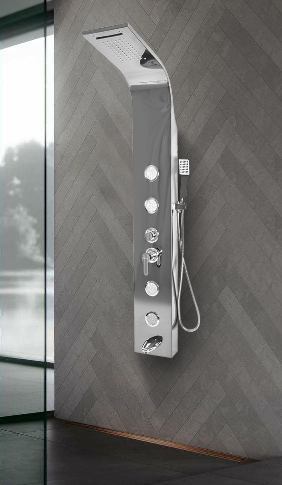 ⚪️Specifikacije: Panel z dežnim tušem, slapom in hidromasažo – celoten komplet, pripravljen za namestitev Dežni tuš in hidromasaža s silikonskimi šobami v tehnologija ANTI-CALC preprečuje nalaganje vodnega kamna