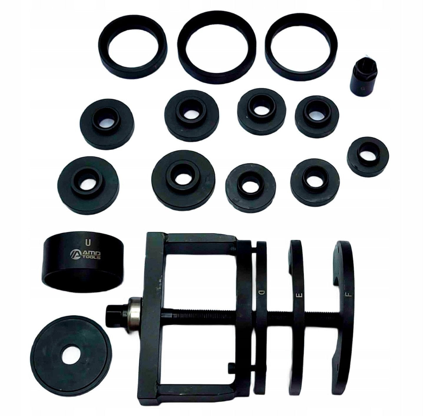 To orodje se uporablja za nameščanje in odstranjevanje pest koles in ležajev. Sestavljen je iz 23 komponent in je shranjen v robustni torbici.