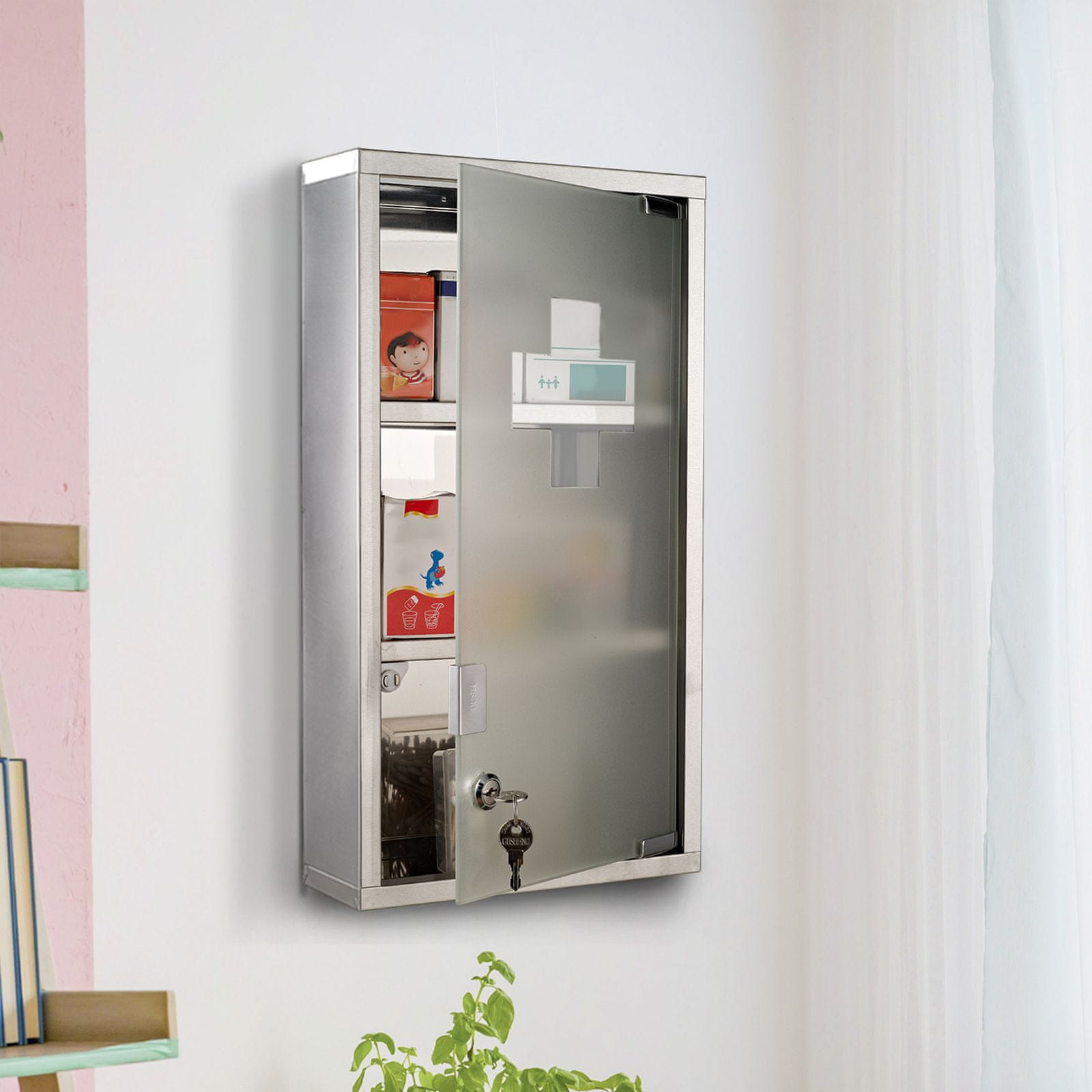 Ta stensko pritrjena lekarniška omarica je nepogrešljiv dodatek za gospodinjstva z otroki in hišnimi ljubljenčki saj zagotavlja varno mesto za shranjevanje zdravil in receptov nedosegljivo otrokom. Izdelana je iz trpežnega nerjavečega jekla ki je odporen proti rji in primeren za uporabo v kopalnicah. Omarica ima tri police za učinkovito organizacijo in matirano sprednjo stran za dodatno zasebnost.