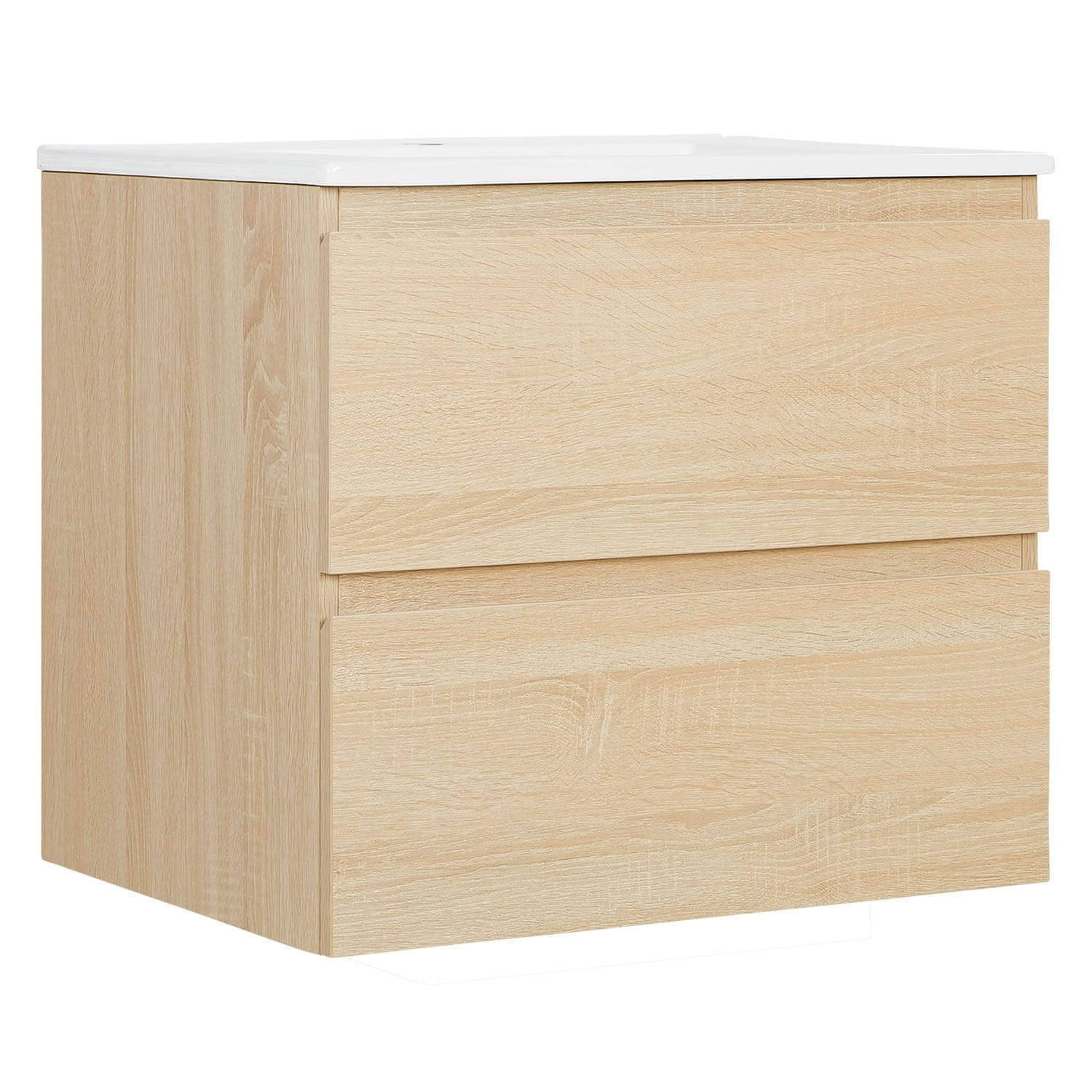 Izboljšajte svojo kopalnico s to elegantno kopalniško omarico, zasnovano za združevanje stila in praktičnosti v kompaktni obliki. Omarica z naravnim hrastovim videzom in sijočim belim keramičnim umivalnikom je idealna tako za glavno kot tudi gostinsko kopalnico. Njeni dve prostorni predali z mehkim zapiranjem nudita dovolj prostora za shranjevanje vaših potrebščin, zato je popolna rešitev za urejeno in brezhibno kopalnico.