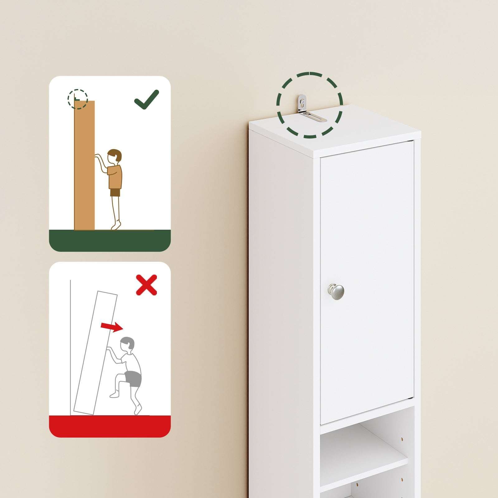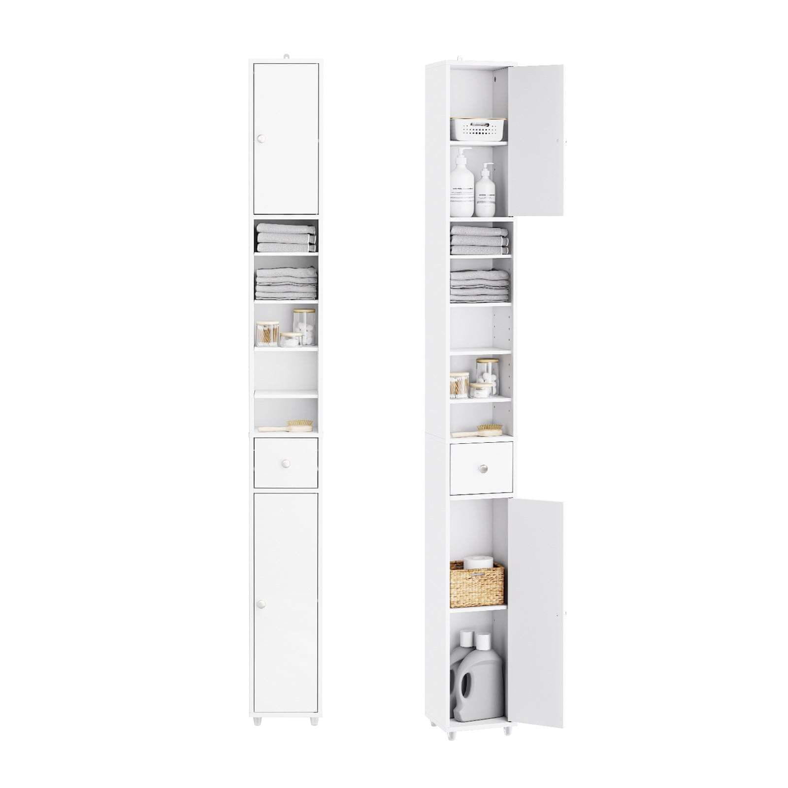 Ta visok prostostoječi kopalniški omarica je zasnovana za učinkovito shranjevanje v majhnih prostorih. Njegov ozek profil je idealen za majhne kopalnice hodnike spalnice ali dnevne sobe saj maksimizira izkoriščenost navpičnega prostora in ohranja prostor urejen. Omarica ima nastavljive police in priročen predal kar omogoča prilagodljivo shranjevanje toaletnih potrebščin čistilnih izdelkov ali osebnih predmetov.