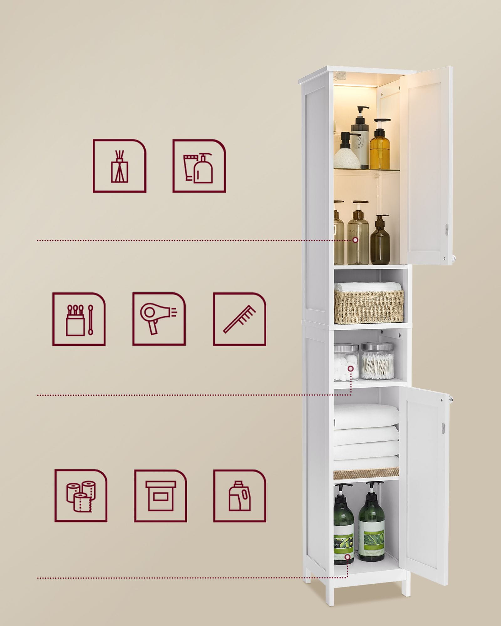 Ta visok in ozek kopalniški omarica je zasnovana za maksimalno izkoriščenost prostora v majhnih prostorih zato je idealna za kompaktne kopalnice ali ozke kote. Njena moderna zasnova vključuje nastavljive police in odprte predale kar omogoča prilagodljivo organizacijo tako večjih kot manjših predmetov. Omarica je enostavna za čiščenje in vključuje varnostne funkcije za varno pritrditev na steno. Material: MDF (vlaknena plošča srednje gostote) Dimenzije: 30×30×170cm Barva (odtenek): Bela Višina (cm): 170 Globina / širina (cm): 30 Dolžina (cm): 30 Material (podrobno): Les plošča – plošče in lesni derivati Z ali brez shranjevalnega prostora: S shranjevalnim prostorom Z ali brez LED: Brez LED Z ali brez ogledala: Brez ogledala