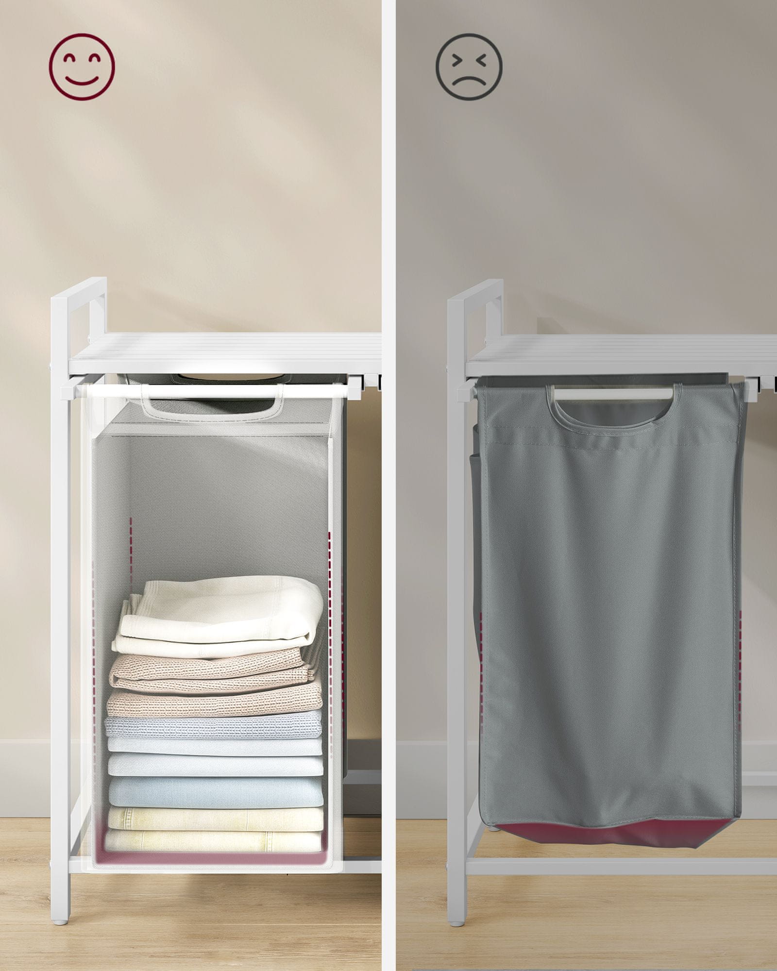 Ta pesukorv sisaldab kahte eemaldatavat kangast kotti ja tugevat metallraami, mis muudab pesu sorteerimise ja transportimise lihtsaks. Selle praktiline disain aitab hoida teie ruumi organiseerituna ja korras. Sobib ideaalselt magamistubadesse, vannitubadesse või pesuruumidesse. Celoten opis