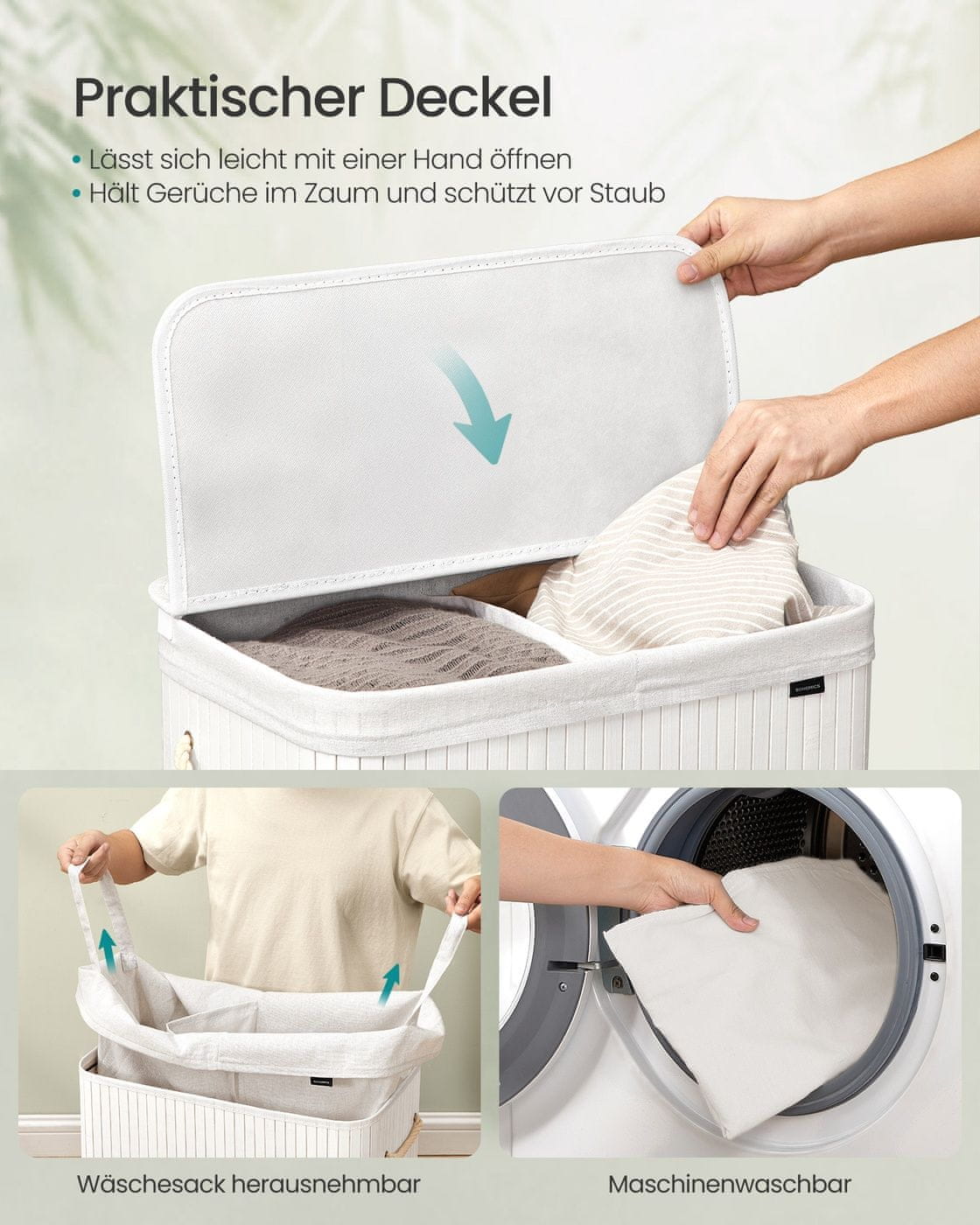 Ta prostorna košara za perilo nudi učinkovito rešitev za organizacijo perila in posteljnine. Oblikovana za udobje ima dva predela in odstranljivo pralno bombažno podlogo kar olajša in organizira dan pranja. Njena zložljiva zasnova in praktični ročaji omogočajo enostaven prevoz in shranjevanje ko ni v uporabi.