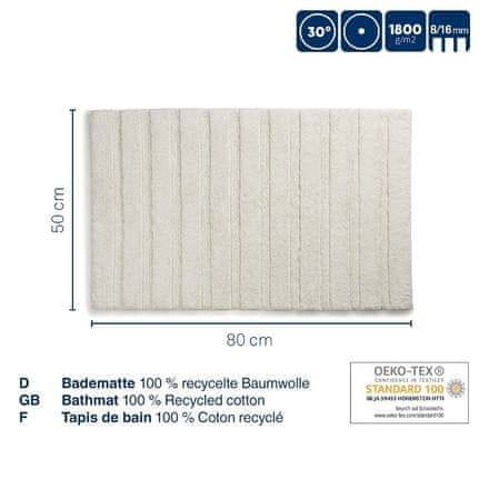 Kopalniška preproga Megan v velikosti 80 × 50 cm je izdelana iz 100 % recikliranega bombaža s težo 1800 g/m?, kar zagotavlja mehko, toplo in udobno površino. Material izpolnjuje standard OEKO-TEX® Standard 100, zato je varen in neškodljiv za zdravje.
