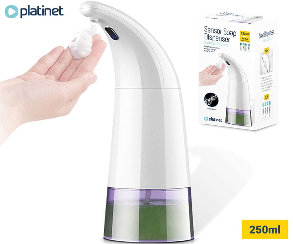 S Platinet PHS280 avtomatskim dozirnikom imate lahko tekočino na roki v trenutku! S tihim motorjem in kapaciteto 250 ml je popoln brezkontaktni dozirnik tekočine, primeren za kuhinje, kopalnice, delovna mesta, mesta za razkuževanje ipd. – brez prenosa mikrobov in bakterij. Samo položite roke pod senzor in dozirnik samodejno sprosti točno določeno količino tekočine