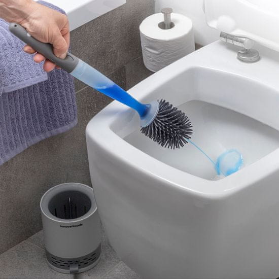 The Bruilet InnovaGoods toilet brush with detergent dispenser offers manyadvantages when compared to conventional toilet brushes. This toilet brush is antibacterial and muchmore hygienic, as the brush contains grooves that filter excess water and aremovable drip tray with ventilation holes for fast and efficient drying. Its rubber bristles are soft and flexible toallow a deep clean, reaching all corners of the toilet without damaging it. Thehandle can be removed and filled with a liquid toilet cleaner which is releasedby pressing a button. It also includes an adhesive support for hanging it onthe wall, if desired.