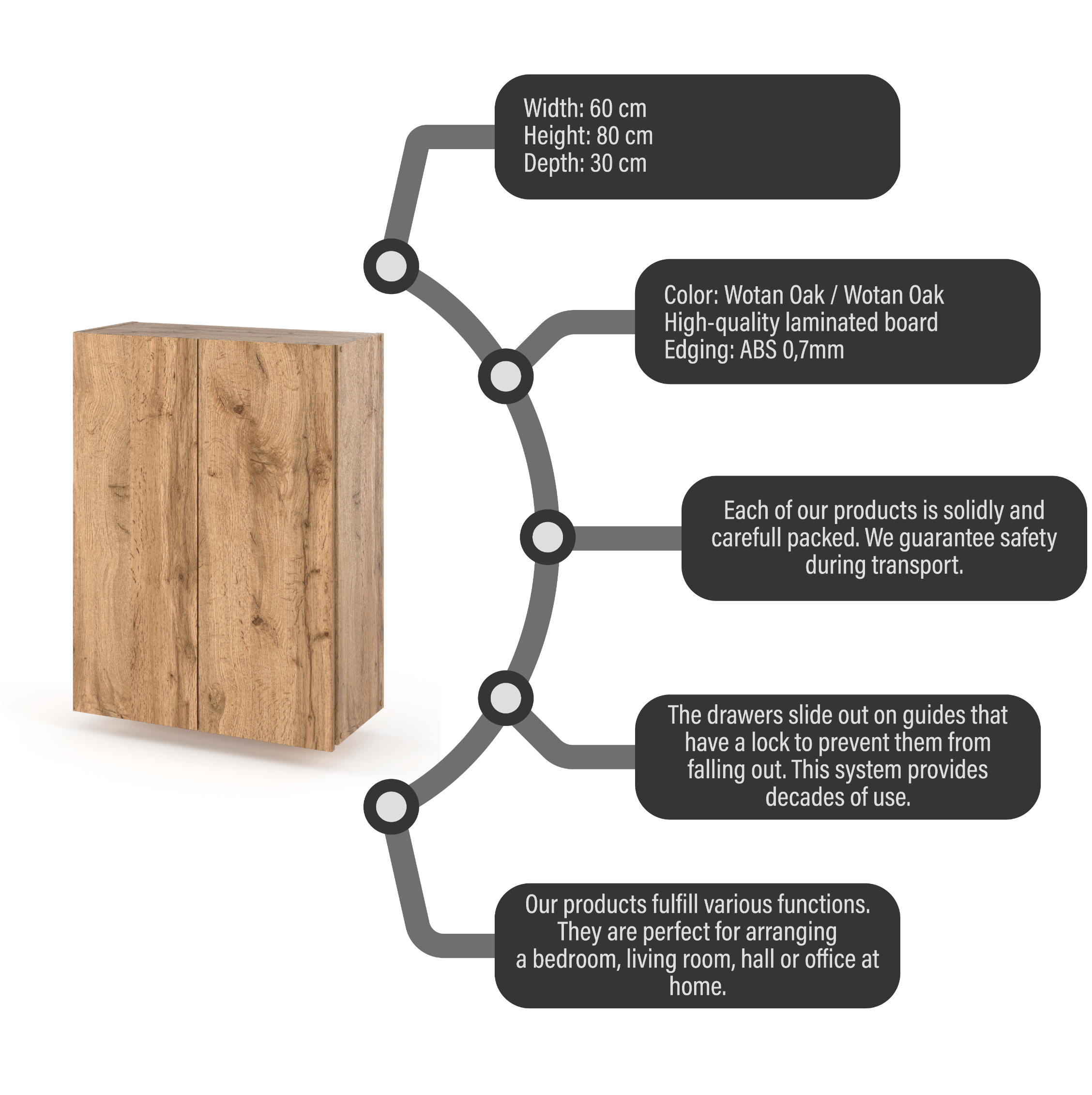 •     Višina: 80 cm, Širina: 60 cm, Globina: 30 cm.