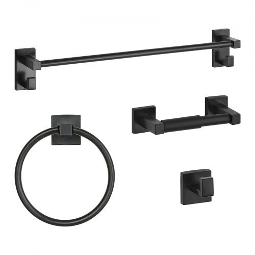Ta 4-delni komplet kopalniške opreme v mat črni barvi vključuje držalo za brisače, obroč za brisačo, kljukico za haljo in držalo za toaletni papir. Izdelan iz nerjavečega jekla, zagotavlja vzdržljivost in sodoben videz, ki pomaga ohraniti vašo kopalnico urejeno in stilsko. Dimenzije: 595×100×80 mm. Celoten opis
