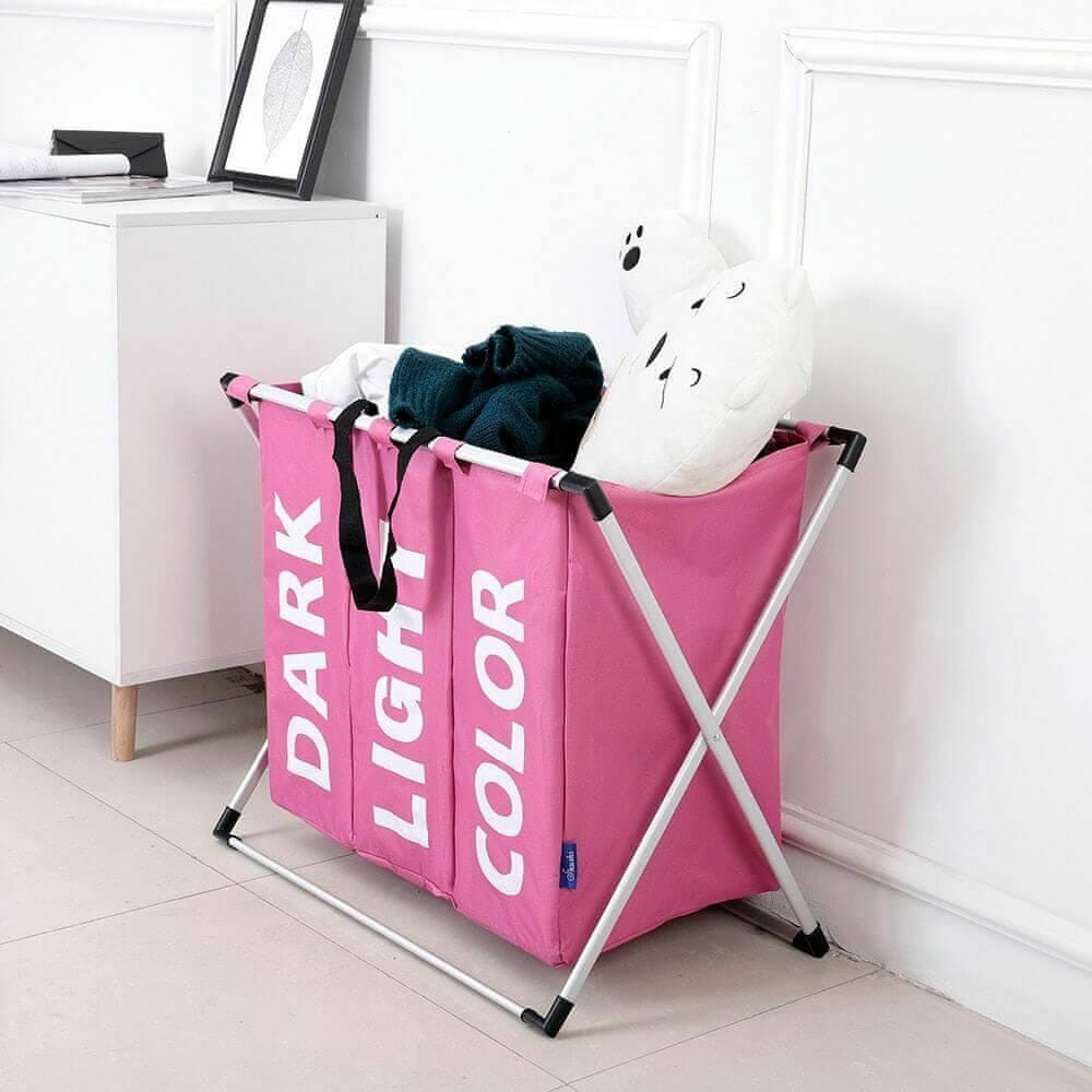 – Elegantna košara za perilo v treh delih za pomoč pri razvrščanju perila