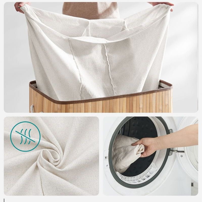 Ta koš za perilo ponuja praktično rešitev za urejeno perilo. S tremi ločenimi predeli lahko perilo preprosto razvrstite na barvno, belo in občutljivo. Snemljiv pokrov omogoča enostavno nalaganje in razlaganje perila, hkrati pa poskrbi, da so oblačila skrita, soba pa videti urejena. Trdna konstrukcija zagotavlja, da bo košara dolgo služila tudi pri vsakodnevni uporabi. Ta koš za perilo je idealen tako za majhna kot velika gospodinjstva, saj združuje funkcionalnost in slog.