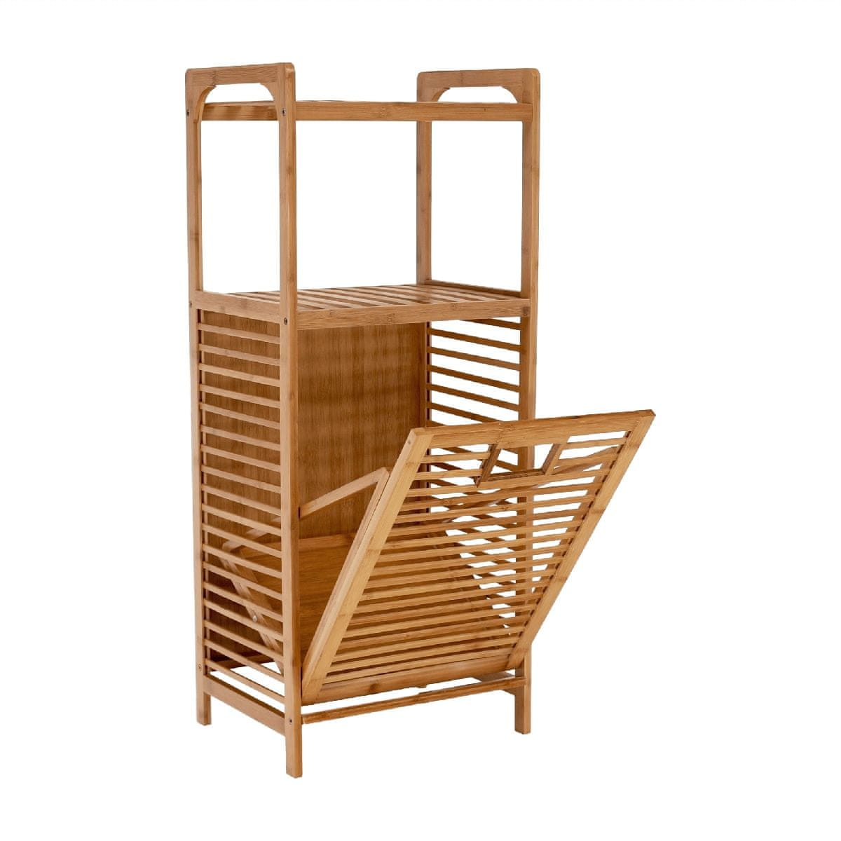 Koš za perilo KERI NEW je dizajn in predvsem praktičen pomočnik za vaš dom. Dimenzije košare so (ŠxGxV): 40×30×95 cm in notranje mere (ŠxGxV): 40×25×50 cm. Njegova nosilnost je do 20 kg. Za izdelavo je bil uporabljen lakiran bambus v naravni barvi. Notranji žep je odstranljiv, iz blaga sive barve. Očistite ga lahko z vlažno krpo. Košara ima tudi odprt, zračen prostor za shranjevanje v obliki polic. Keri New bo poskrbel, da bo vaše gospodinjstvo vedno pospravljeno. Dostavljen je sestavljen.