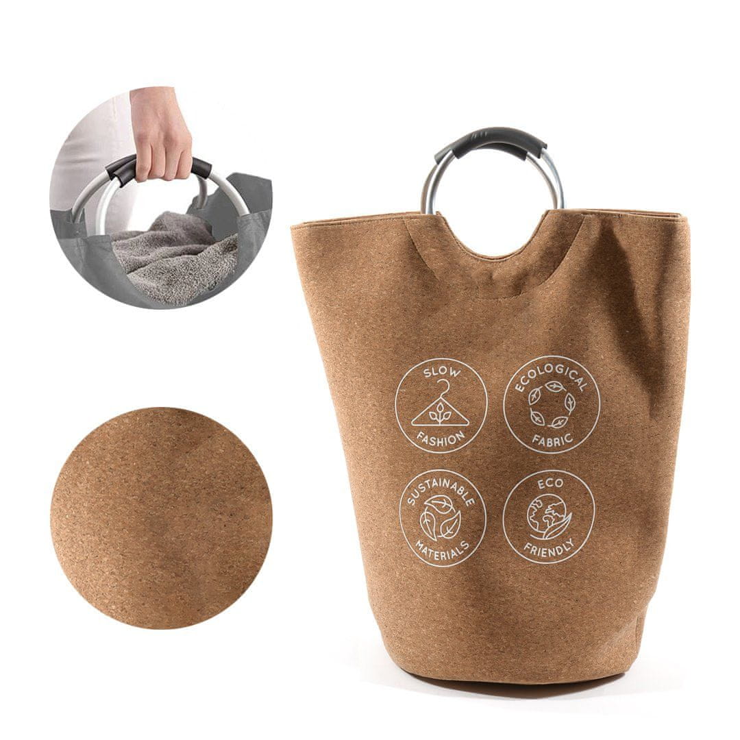Prenosna vreča Cork je izdelana iz trpežnega poliestra (20 %) in plute (80 %), zato je idealna za zbiranje umazanega perila, za shranjevanje oblačil ali igrač. Dom boste ohranili vedno čist in urejen. Priročni kovinski ročaji, oblazinjeni z gumo, omogočajo enostavno premikanje in prenašanje. Po uporabi jo preprosto zložite in pospravite v predalnik, saj zavzame malo prostora.