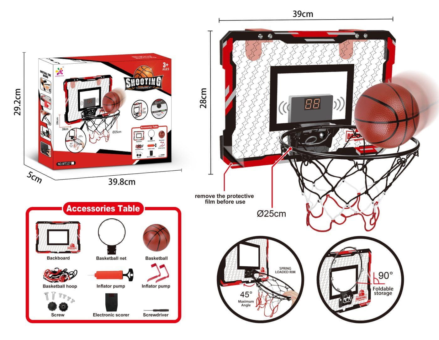 Koš za košarko s števcem in žogo. Dimenzije table 39×28 cm. Košarico je mogoče zložiti na ploščo za lažje shranjevanje. Vključuje koš, mrežo, žogo in črpalko. 3×AAA baterije so priložene.
