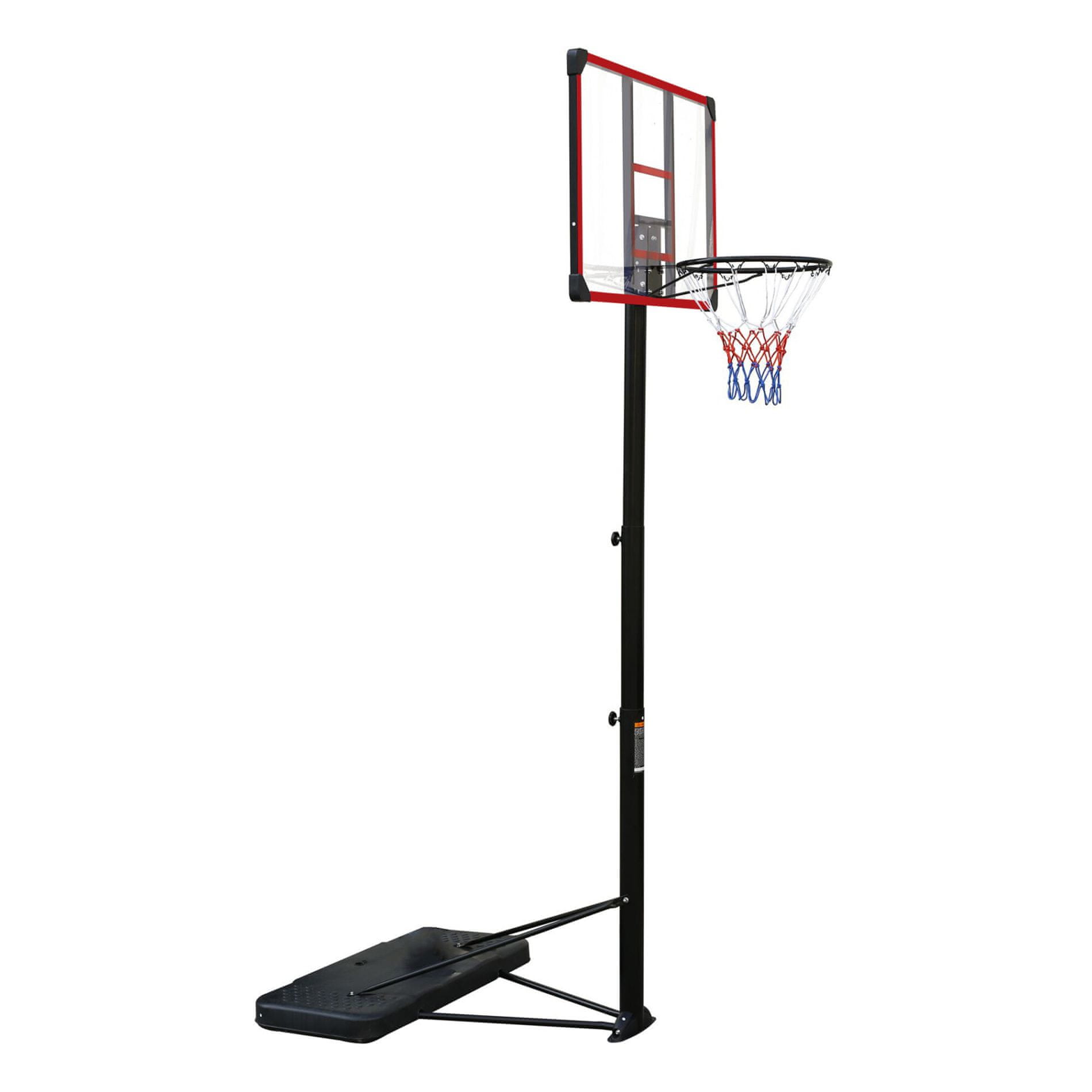 Mobilni koš za košarko z nastavljivo višino, trdno plastično ploščo in obročem z mrežo.