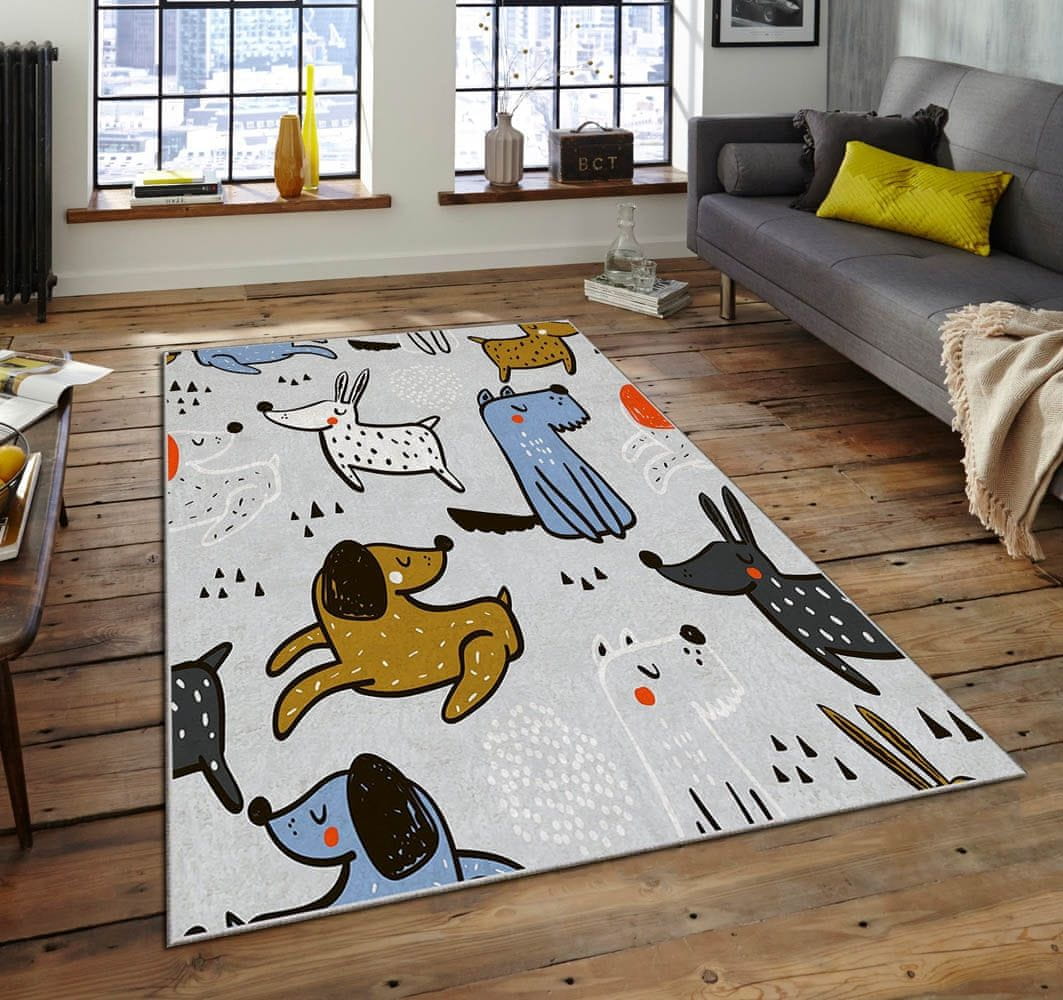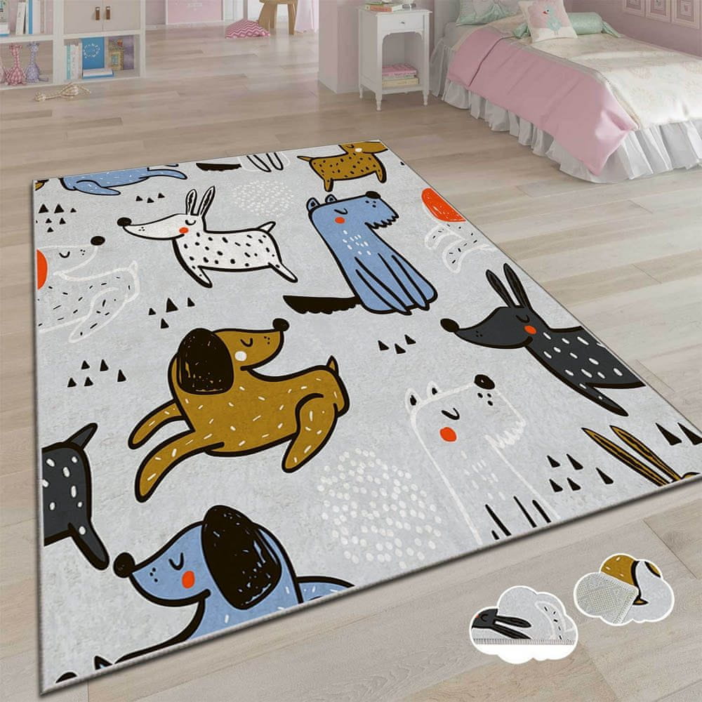 Mehka in udobna otroška preproga PSI 160×230 CM bo vašim malčkom omogočala prijetno igro na preprogi z motivom psov, ki dodatno poživijo prostor.