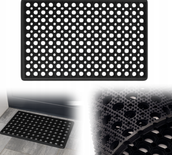 Trpežna in praktična gumijasta vhodna brisača je idealna za vse vrste vhodov – domače ali komercialne. Izdelana iz visokokakovostne gume, je odporna na vremenske vplive in intenzivno uporabo 🌧️☀️. Posebna perforirana površina učinkovito odstranjuje blato, pesek in vlago z obutve.