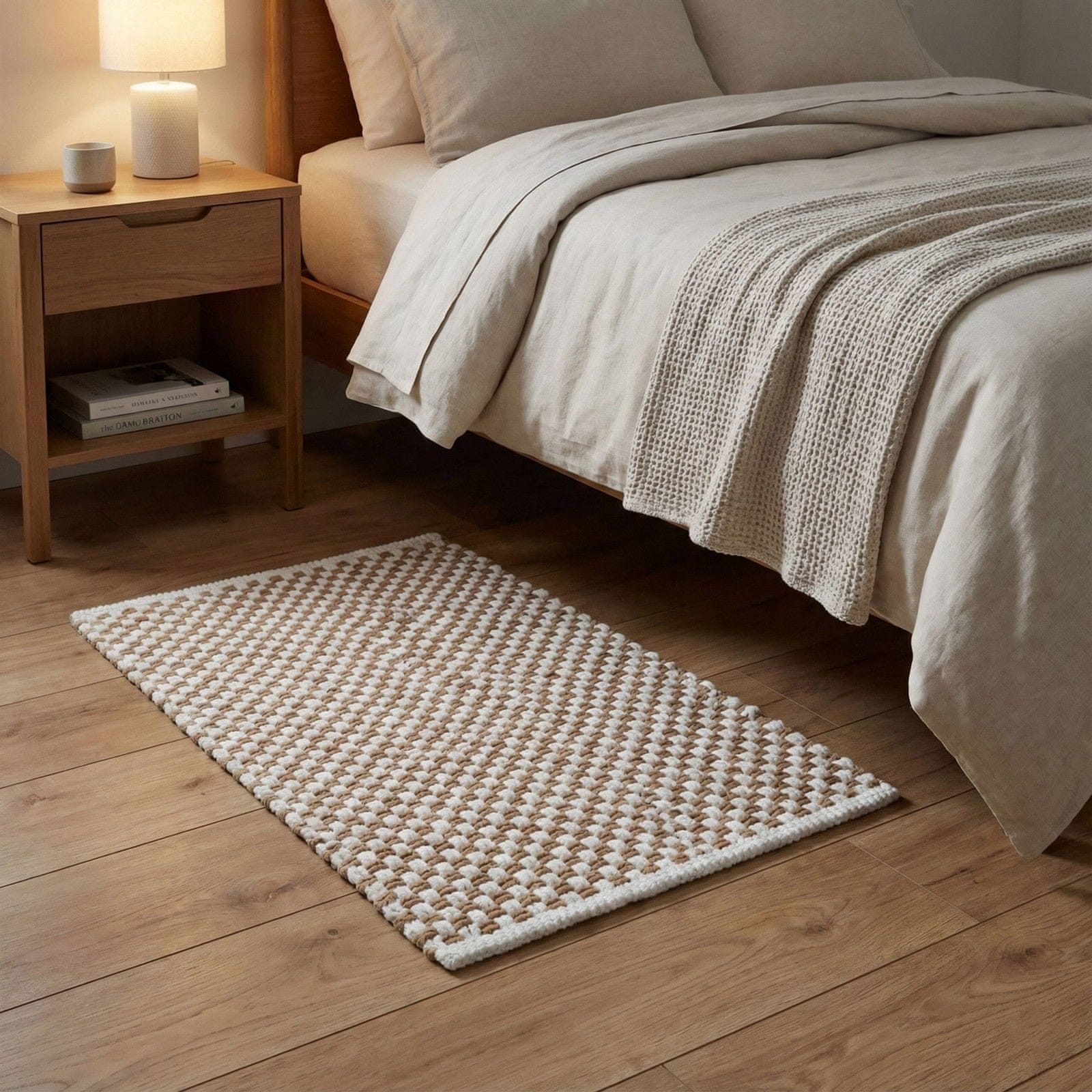 Ta edinstvena tkana preproga, ki meri 50×80 cm, je odličen dodatek za spalnico ali drug prostor, ki potrebuje udobje in toplino.