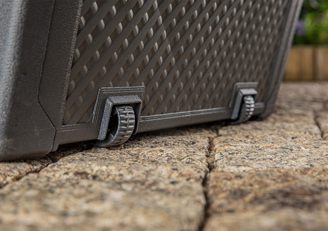 Lådan är utformad för förvaring av en mängd olika trädgårdsredskap och tillbehör, kuddar och barnleksaker.