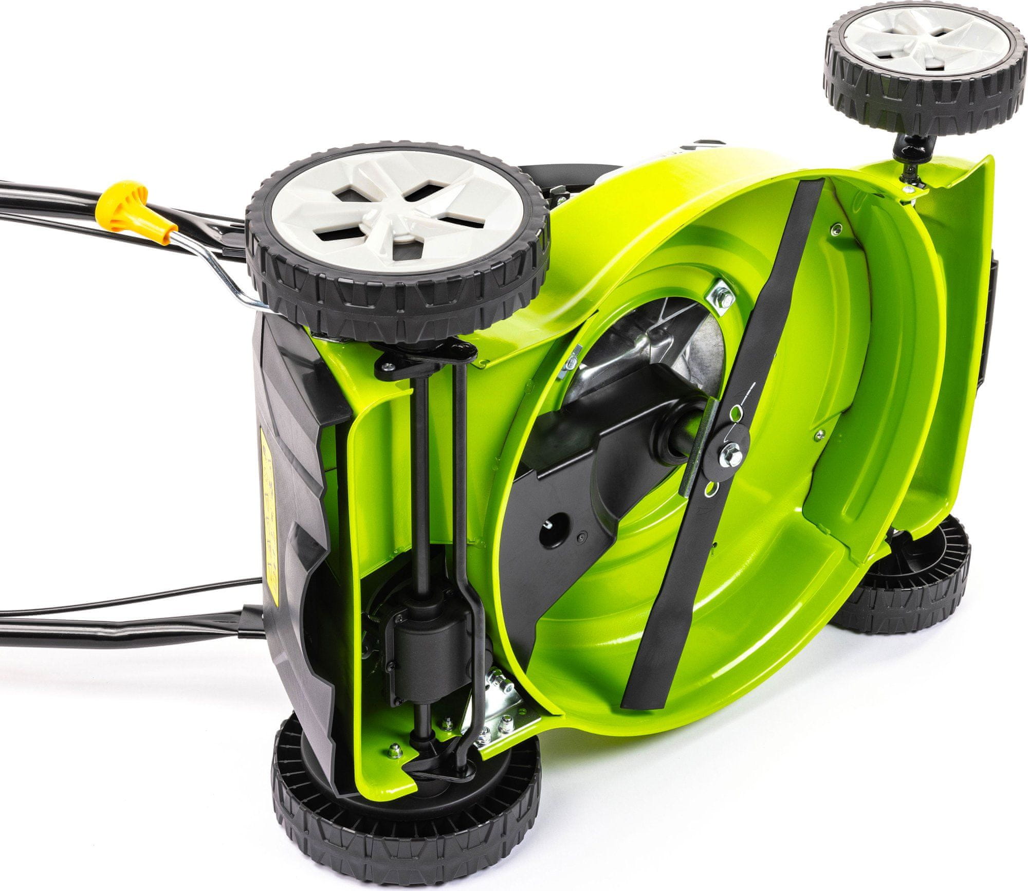 Širina košnje 420 mm v kombinaciji s centralno nastavitvijo višine v 8 položajih omogoča natančno urejanje trate v razponu od 20 do 75 mm. Kolesa s krogličnimi ležaji poskrbijo za tekočo vožnjo in manjšo stopnjo upora pri manevriranju med ovirami na vrtu.