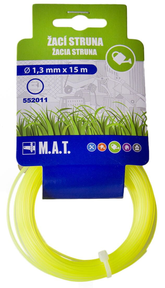 • kakovostna rezalna struna za vse vrste obrezovalnikov in kosilnic – poliamid z dodatki za trdnost in prožnost – okrogli profil premera 1,3 mm in dolžine 15 m – EAN 8590419552013