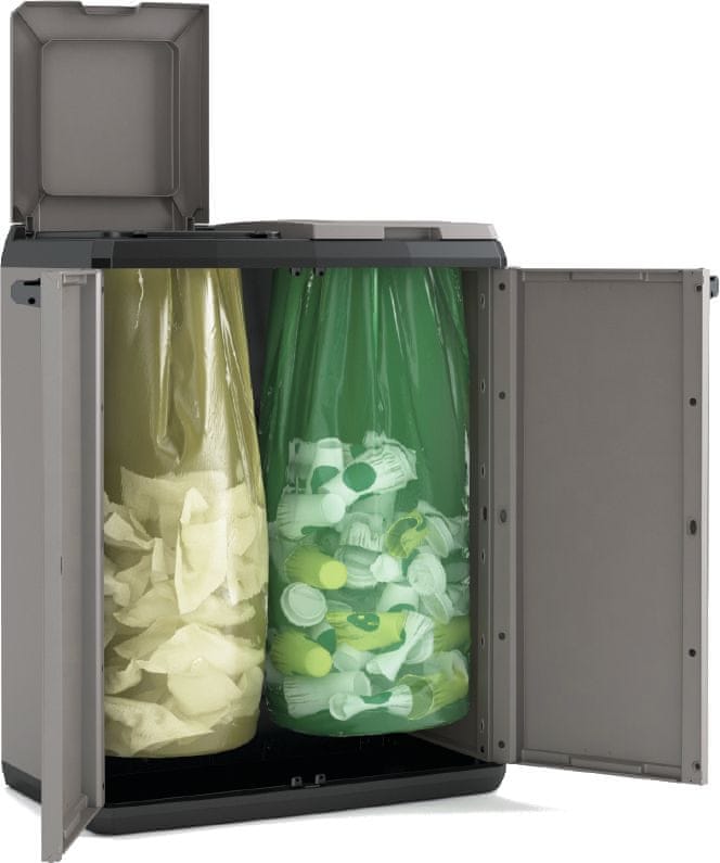 Koš za odpadke Kis Basic vsebuje prostor za dve vreči za odpadke s prostornino 2 × 110 l.Koš je oblikovan v omarico. Vreči imata vsaka svoj pokrov, zato bo ločevanje odpadkov še lažje, poleg tega pa bodo neprijetne vonjave ostale v notranjosti. Celoten opis