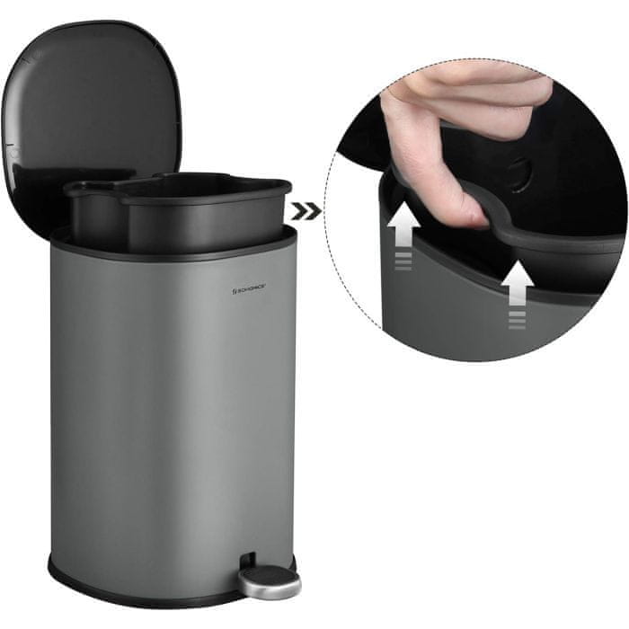 SONGMICS 5-litrski pedalni koš iz jekla z notranjo posodo in ročajem na pokrovu, tesnilni pokrov, za kopalnico in stranišče, siva in črna, model LTB14GS