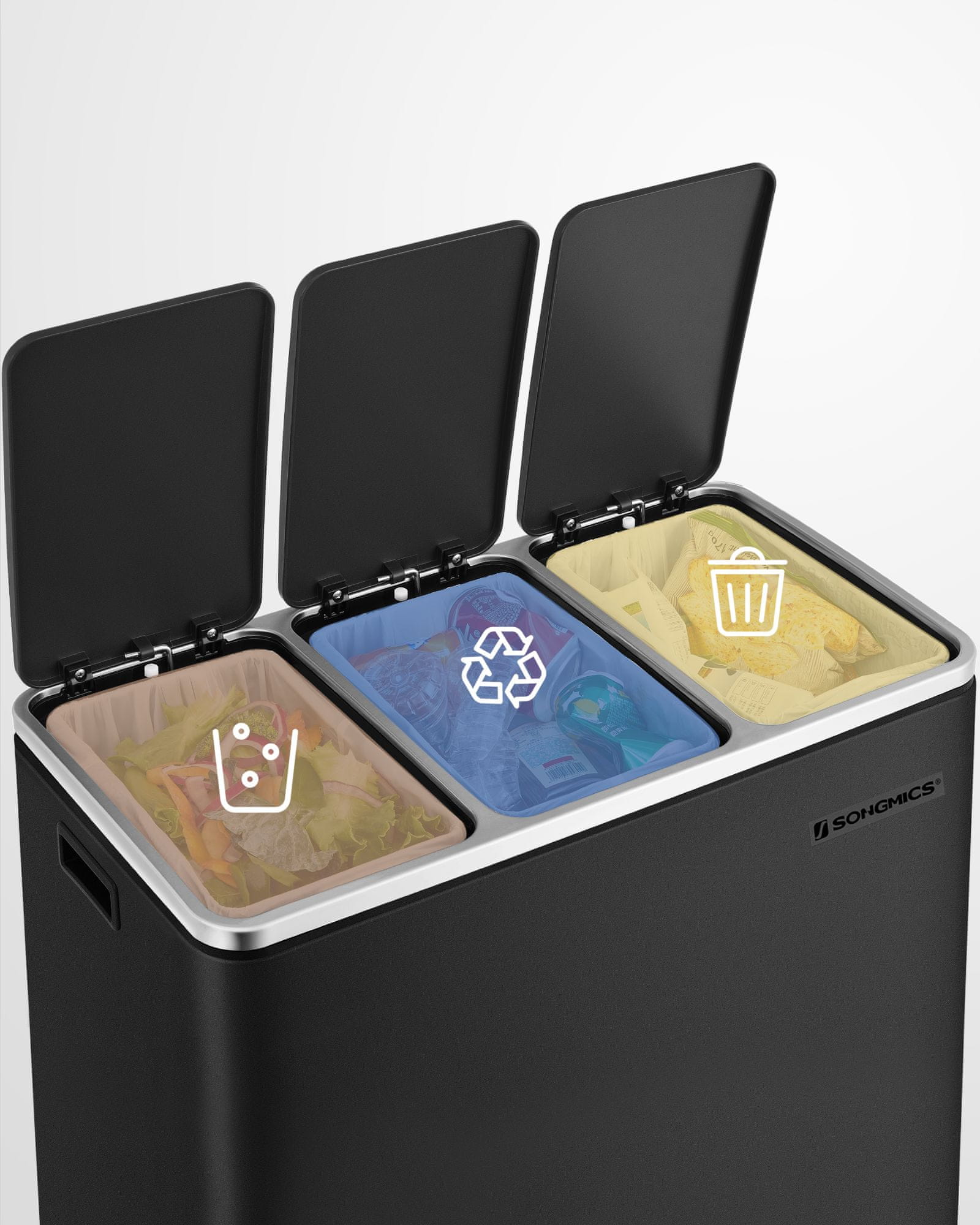 Songmics Reciklirni zabojnik, 3-prekatni pedalni koš, 61x34x55,5 cm, črna