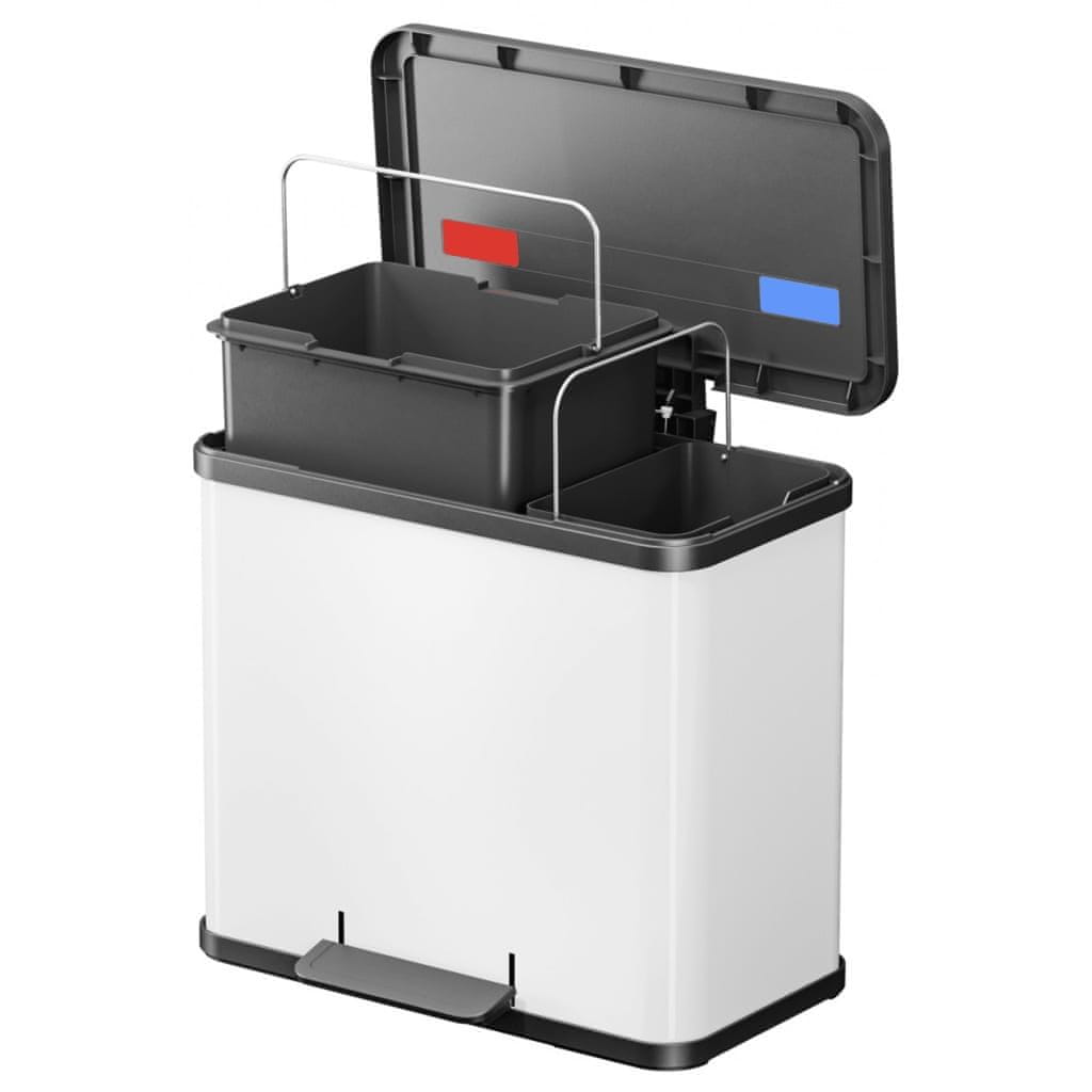 Smetnjak ima dva notranja koša (17 L + 9 L) za ločevanje smeti ter pokrov s širokim kotom odpiranja in počasnim zapiranjem. Pedal s higienskim notranjim mehanizmom je zelo širok za preprosto uporabo. Notranja koša imata priročne ročaje.