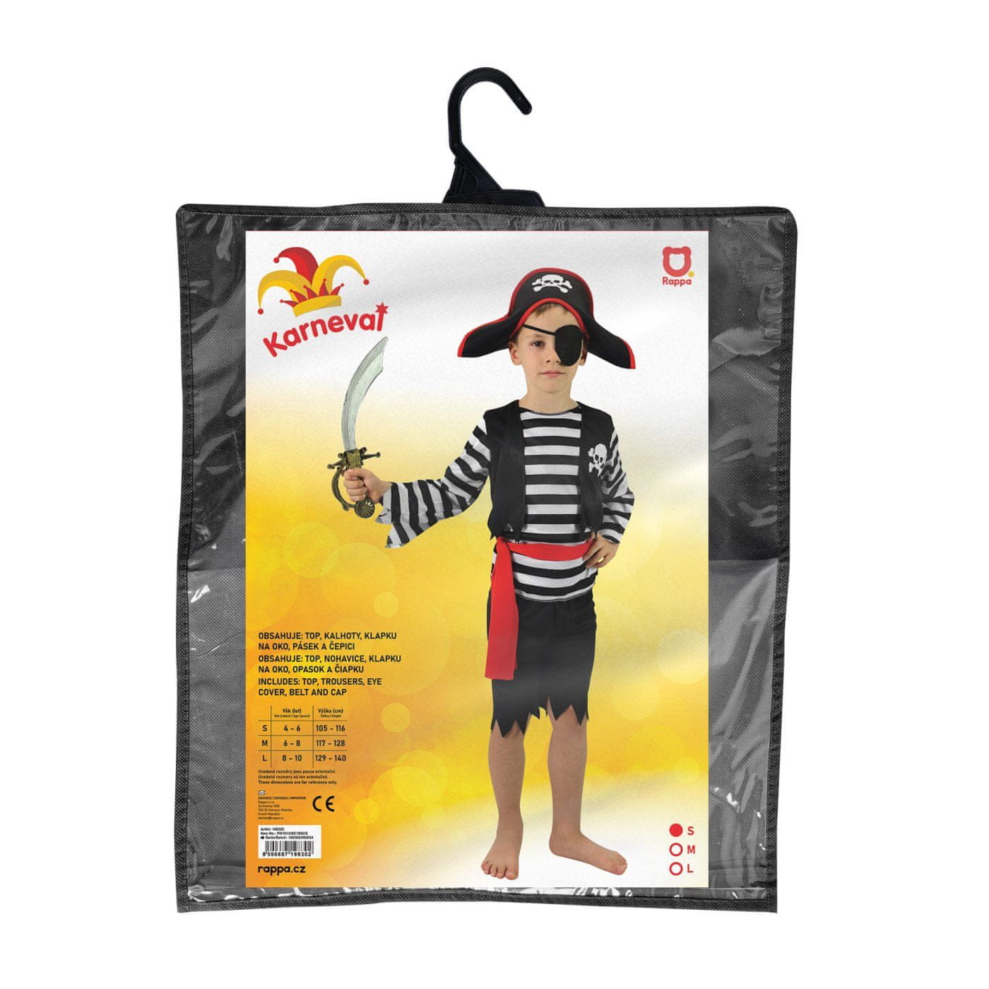 Karnevalski kostum, ki vas spremeni v malega pirata! Kostum v velikosti S je namenjen dečkom, starim od 4 do 6 let (105–116 cm). Paket vsebuje zgornji del, hlače, pas, trak za oči in eleganten piratski klobuk. Ne vključuje sablje.
