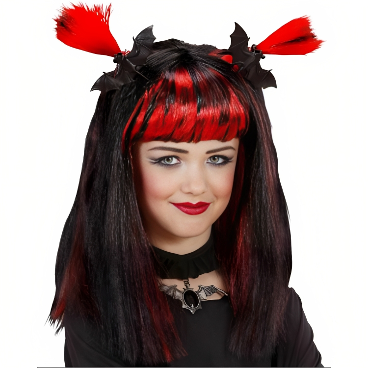 Dekliška otroška pustna lasulja v rdeči barvi. Lasulja ima na živahnih čopkih dva pajka, ki ustvarjata občutek groze. Lasulja Halloween s čopki in barvastimi prameni. Celoten opis