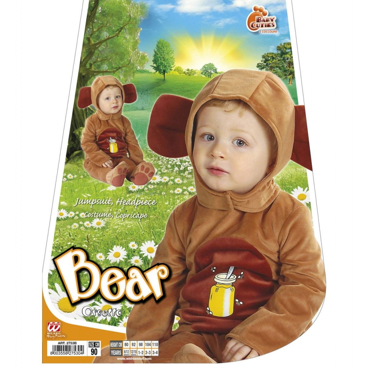 Otroški Pustni kostum Medvedek priznane blagovne znamke Widmann. Pustni kostum je narejen iz kvalitetnega in udobnega materiala. V paketu dobite plišastega pajaca s kapuco. Na kapuci je glava živali. Za lažje oblačenje ima pajac spredaj zadrgo. Celoten opis