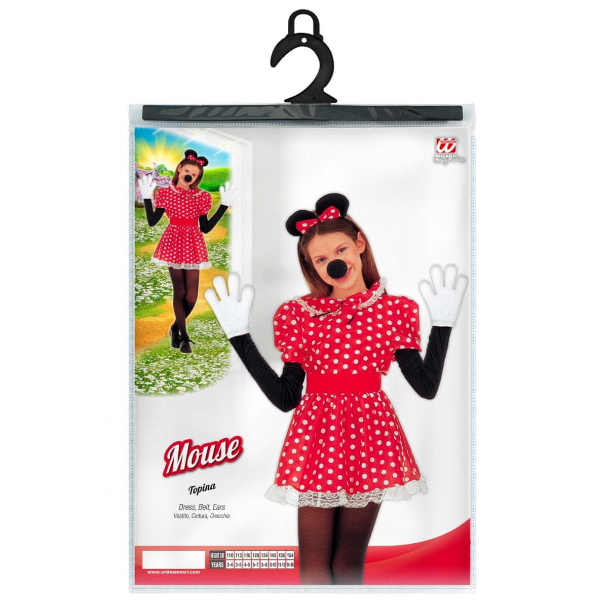Otroški pustni kostum miška priznane blagovne znamke Widmann. Kostum miške je na voljo v treh različnih velikostih: 128 cm (5 – 7 let), 140 cm (8 – 10 let) in 158 cm (11 – 13 let). V kompletu prejmete obleko (rdečo z belimi pikami), pas in ušesa. Rokavice, nos in nogavice niso del kompleta! Celoten opis