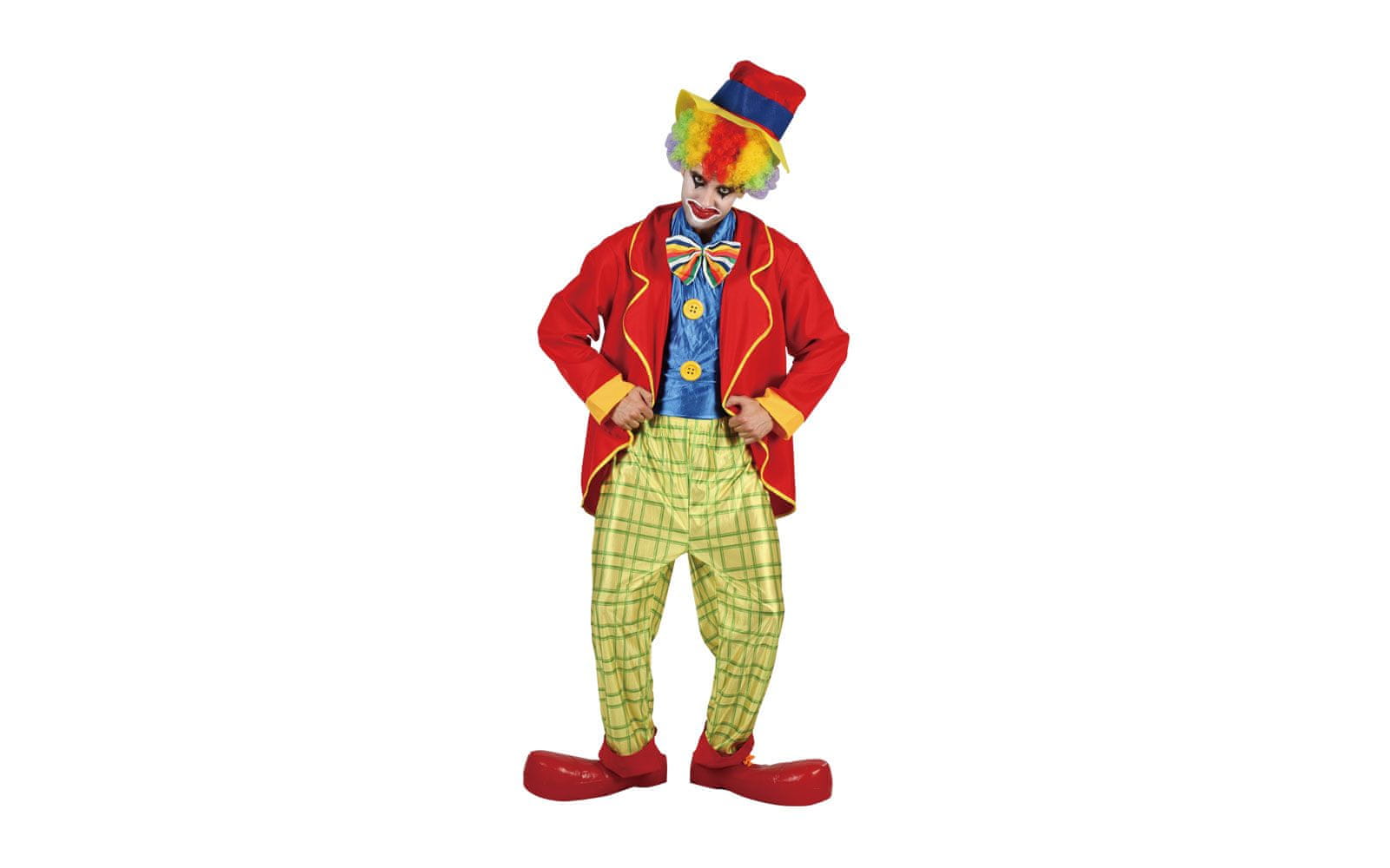 Pustni kostum za odrasle klovn vsebuje plašč, hlače, lažno srajco z metuljčkom in klobuk (čevlji in lasulja niso priloženi). Velikost L. Celoten opis