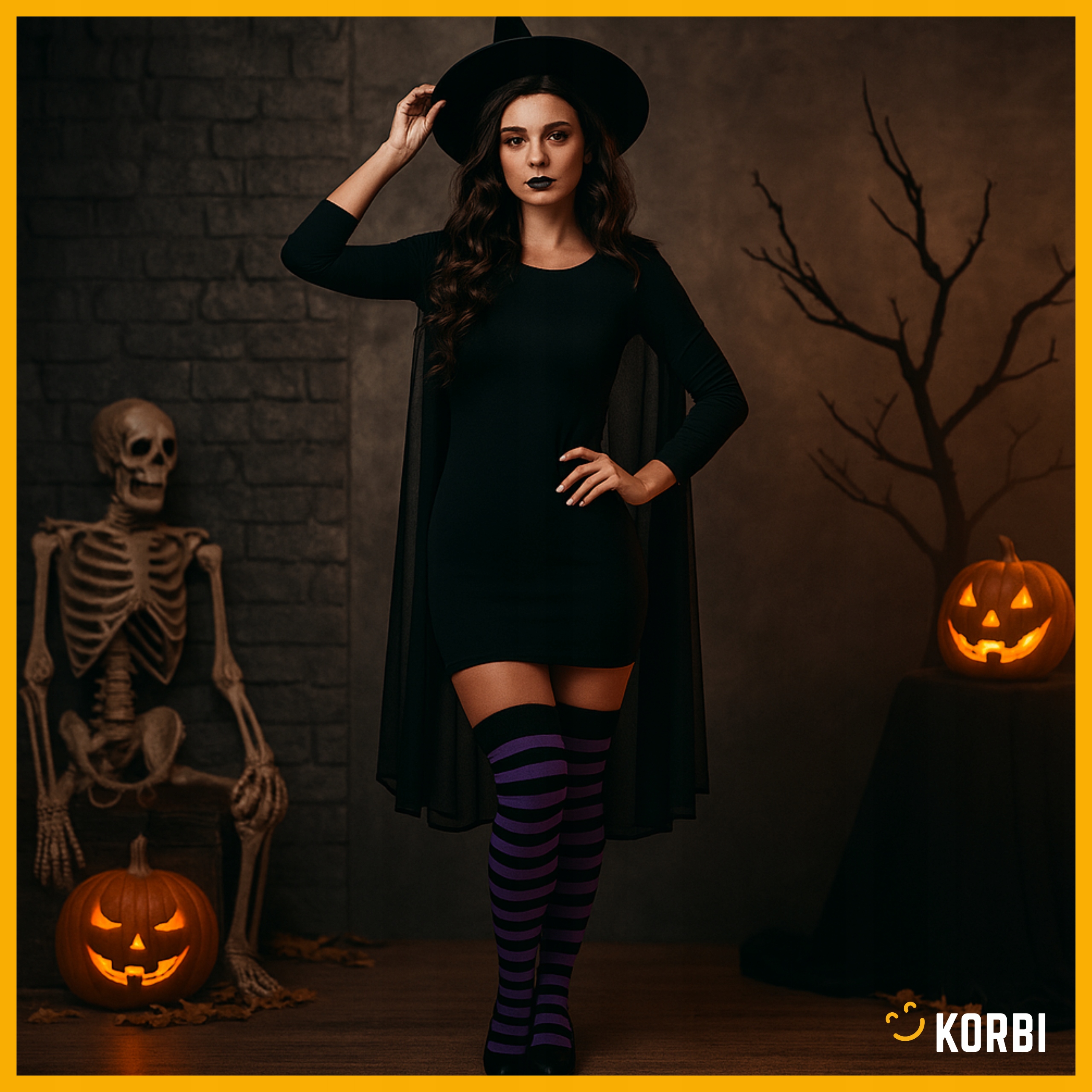 Črtaste nogavice so kultni del kostuma čarovnice – odlično se ujemajo s črnimi oblekami, plašči, klobuki ali korzeti. Dodajo kostumu pravljeniški, a rahlo prevzeten značaj. Popolno dopolnilo tako za pustne plese kot tudi za halloween sprehod z otroki.