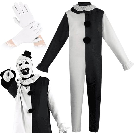 ✅ Popoln kostum za tematske zabave, Halloween in karneval! Ta izrazit črno-beli klaunski kostum, navdihnjen s filmom Terrifier, vključuje enodelni kombinezon z značilnim črno-belim vzorcem. Rokavi so zaključeni z volančki, ki dajejo kostumu teatralen, skoraj cirkuški izgled. Spredaj sta dva črna cofka, ki posnemata gumbe. Dodatki vključujejo dekorativni ovratnik z nabrano tkanino in bele rokavice, ki dopolnjujejo kostum in poudarjajo elegantno-mračen videz.