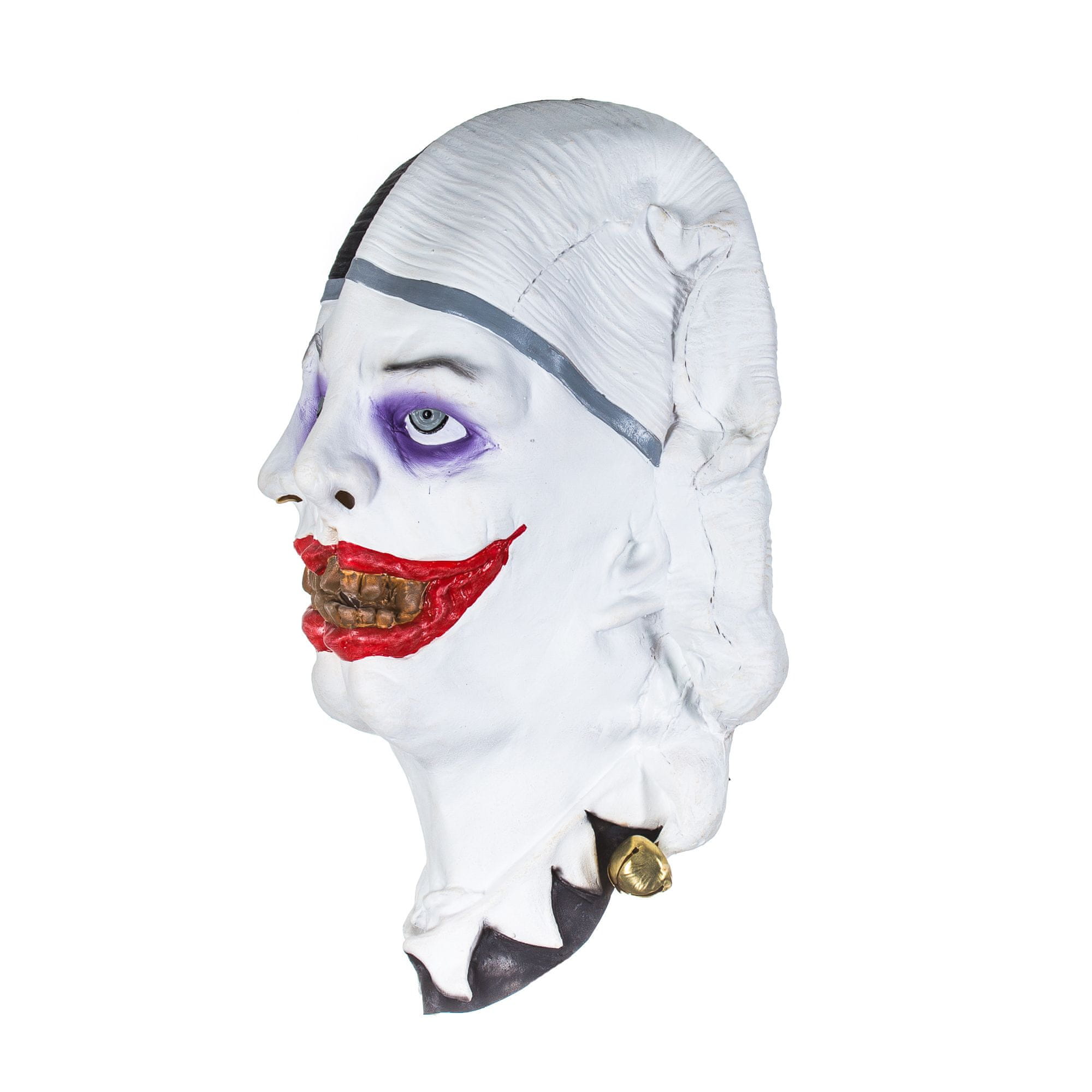 Maska klovna z dvojnim obrazom pokriva celotno glavo in del vratu. Klovn ima podaljšan vrat, zaradi česar je videti bolj realistično in ga lahko potegnete pod majico. Poleg tega so na klobuk pritrjeni zvončki.
